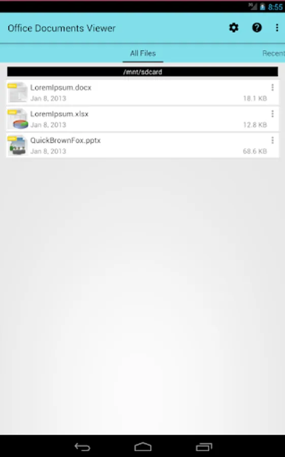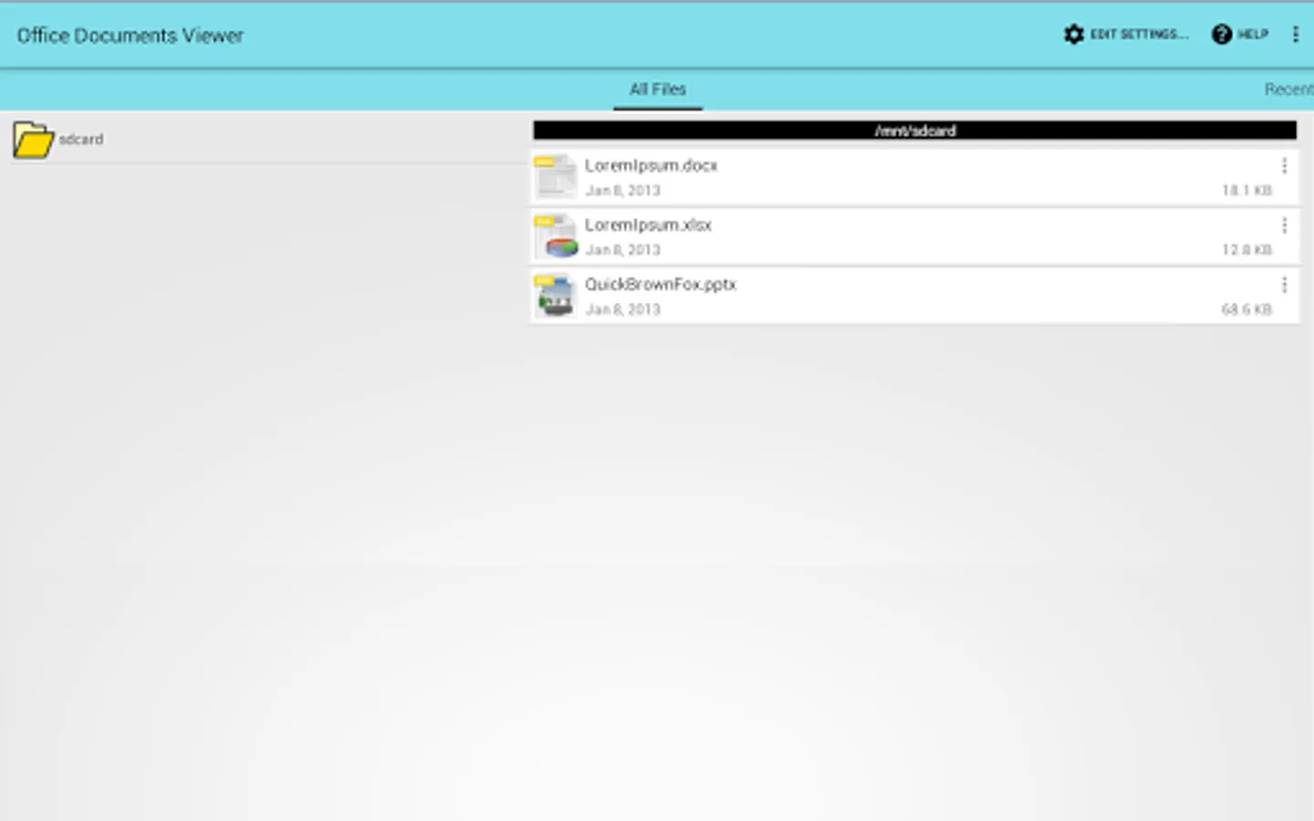 Small and fast document viewing application for Open Document Format (OpenOffice, LibreOffice), OOXML (Microsoft Office) and other productivity document formats. It allows opening office productivity application documents, like text files, spreadsheets or presentations, located in the filesystem, e.g. on sd card, as well downloaded documents, files on Dropbox, Box, or documents files attached to an email.