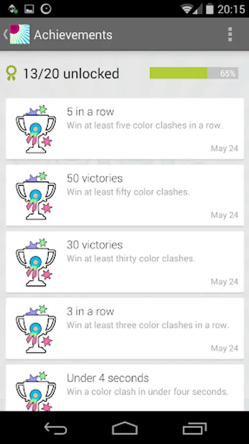 Play Color Clash to unlock achievements and rise through the ranks of online leader-boards. You can decide though, if you would like to compare yourself with your friends only or with the whole world.