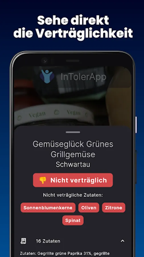 Intolerances such as histamine intolerance, sorbitol intolerance and fructose intolerance can lead to unpleasant symptoms in many people if they do not consciously pay attention to their diet. With the InTolerApp - Histamine Scanner you now have the opportunity to quickly and easily check products for their tolerability.