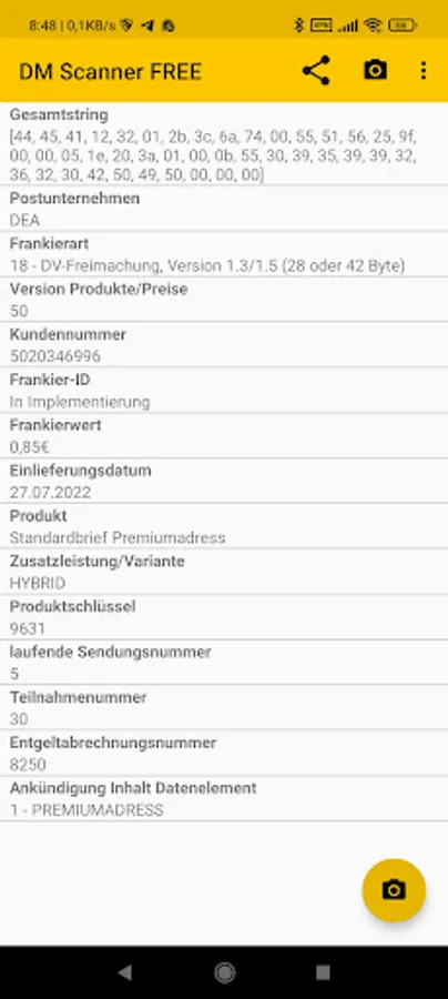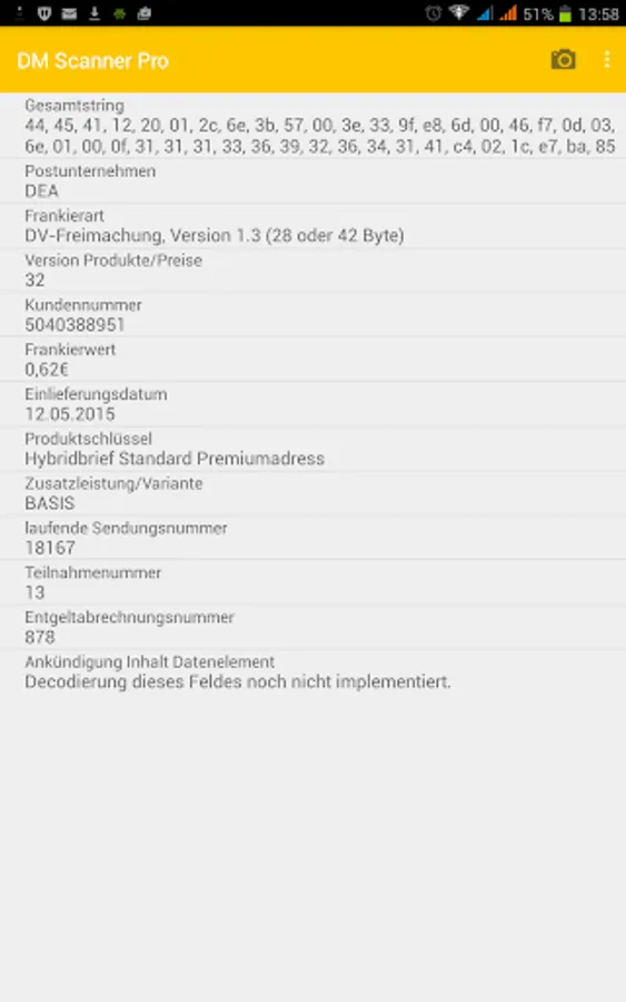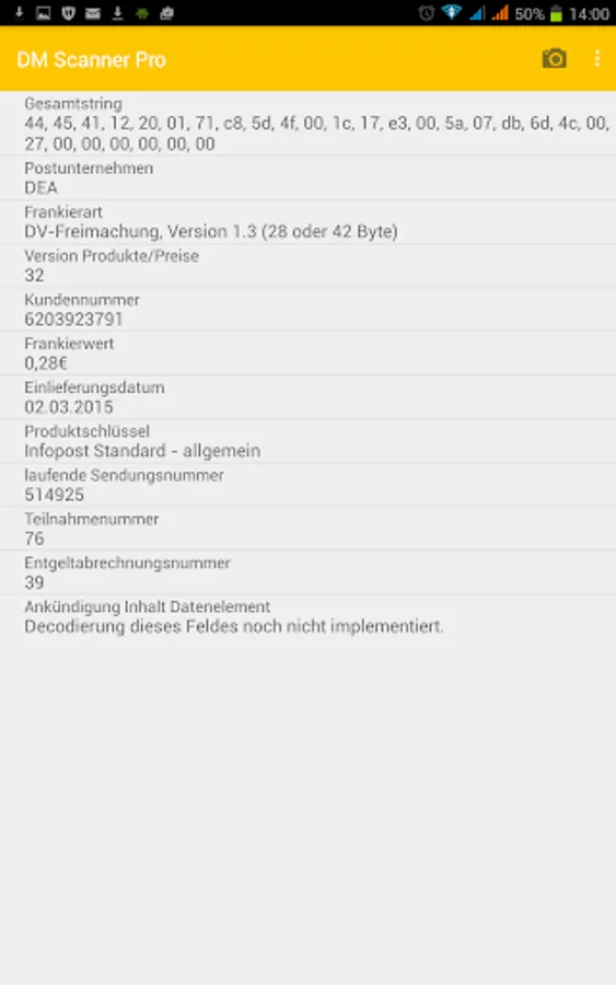 The values of the fields "Ankündigung Inhalt Datenelement" and "Ankündigung postalischer Datenelemente" can be decoded with the PRO-version.