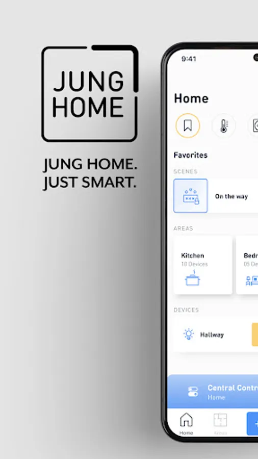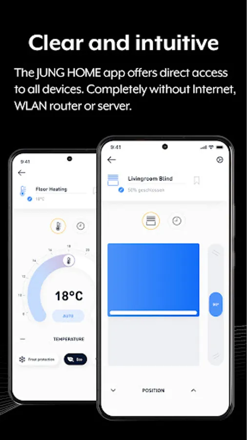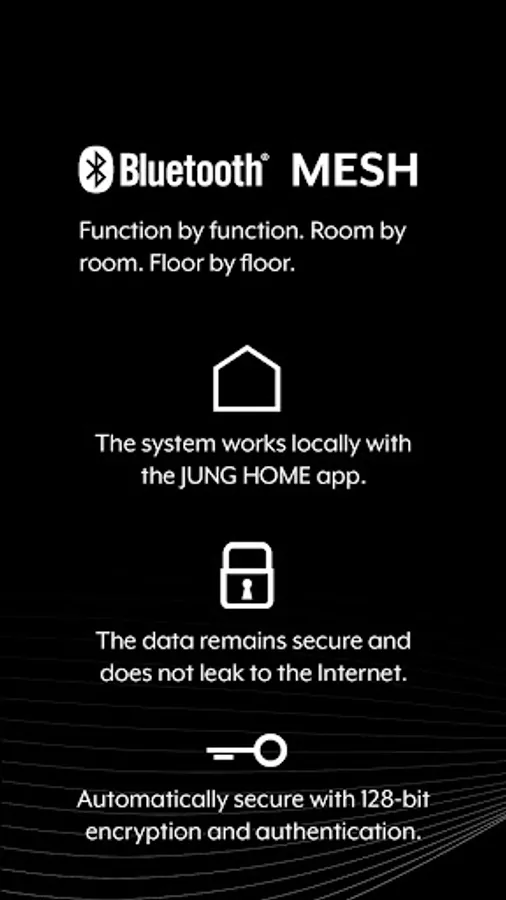 The JUNG HOME app links all the devices in your JUNG HOME system locally via Bluetooth Mesh SIG. Without the Internet, WLAN router or server, the app offers direct access to all the installed JUNG HOME devices. The wireless Bluetooth Mesh communication within the system is fully encrypted.