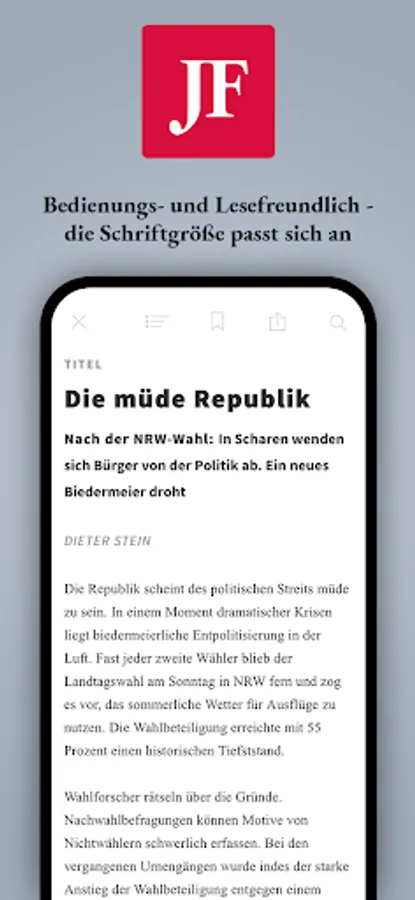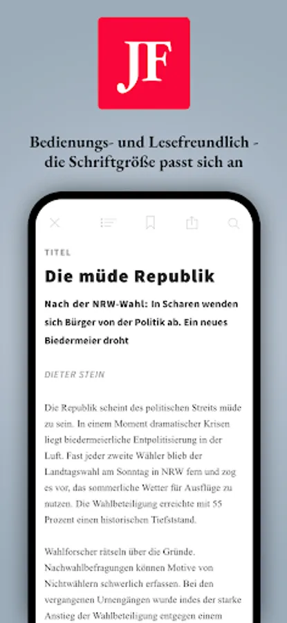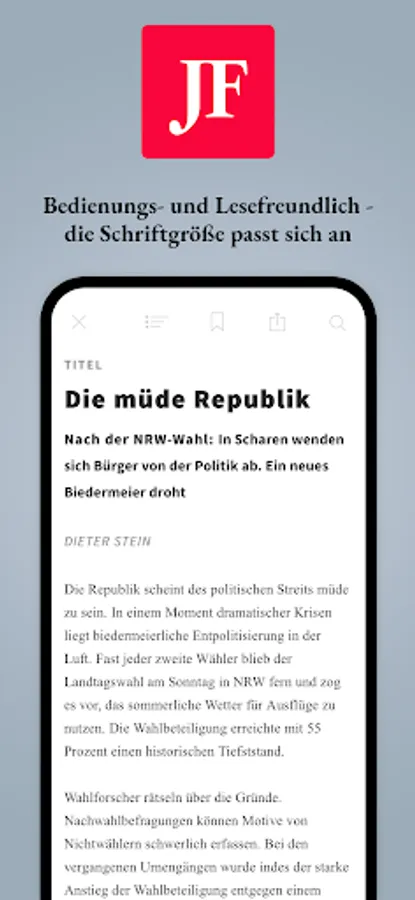 The JF app gives you access to the electronic version of the JF print edition. Individual editions can be purchased in the app and subscribers have access to all digital editions of the last few months.