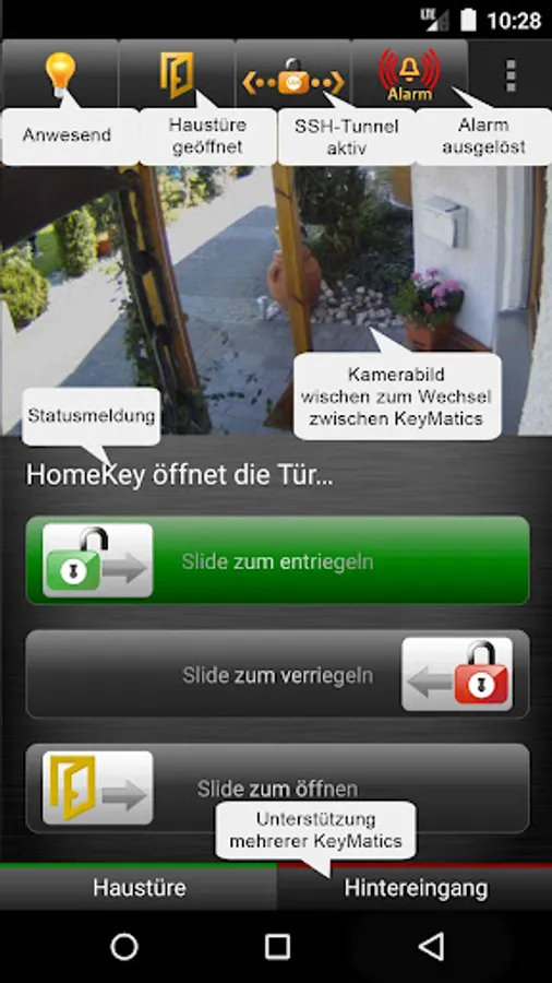 With HomeKey you have your KeyMatic HomeMatic control at all times and can make your remote control to leave at home: your phone becomes the key of your house! The additional configurable IP camera you can see in the house or thanks SSH tunnel on the road, who is at the door when it rings and you can allow family members or friends directly into it, without having to get up from the couch. Using NFC tags can processes as open door or lock KeyMatic be greatly simplified: just stick a tag beside the front door and assign the action "Open" or "Lock" to it.