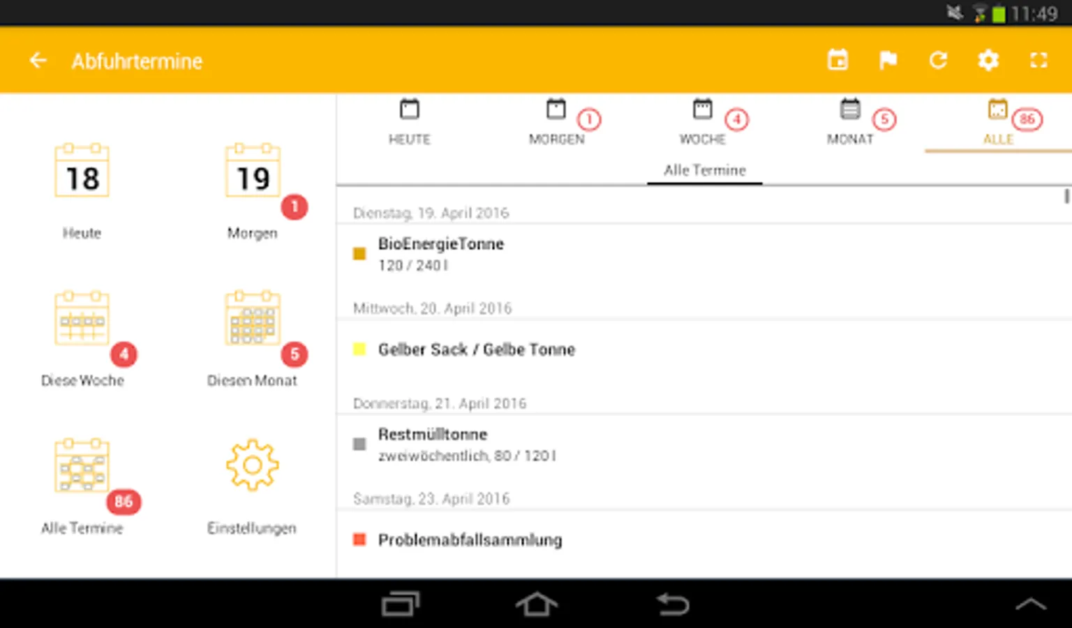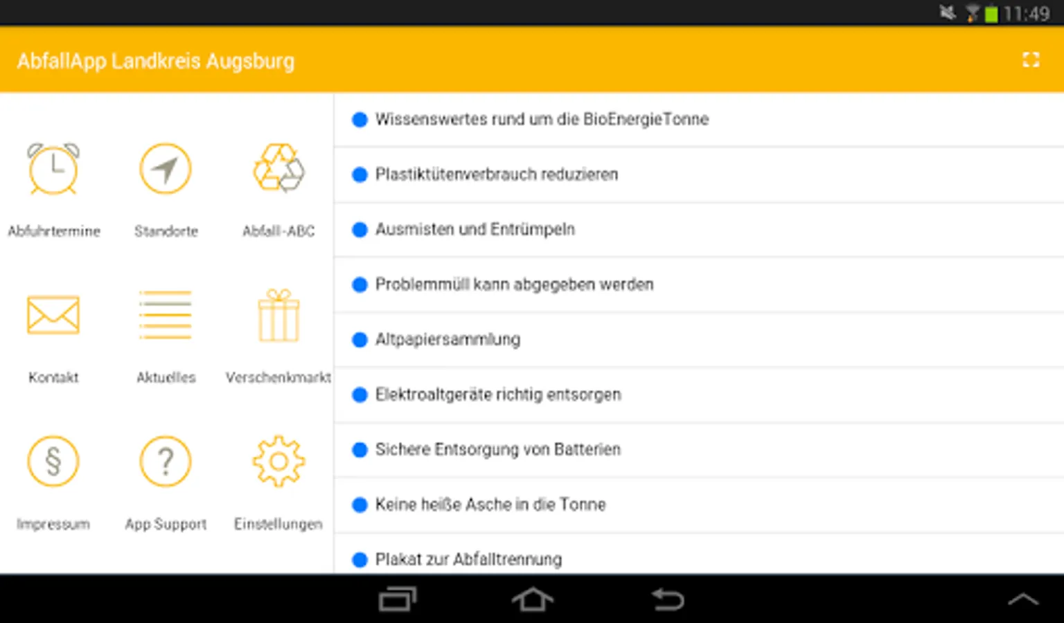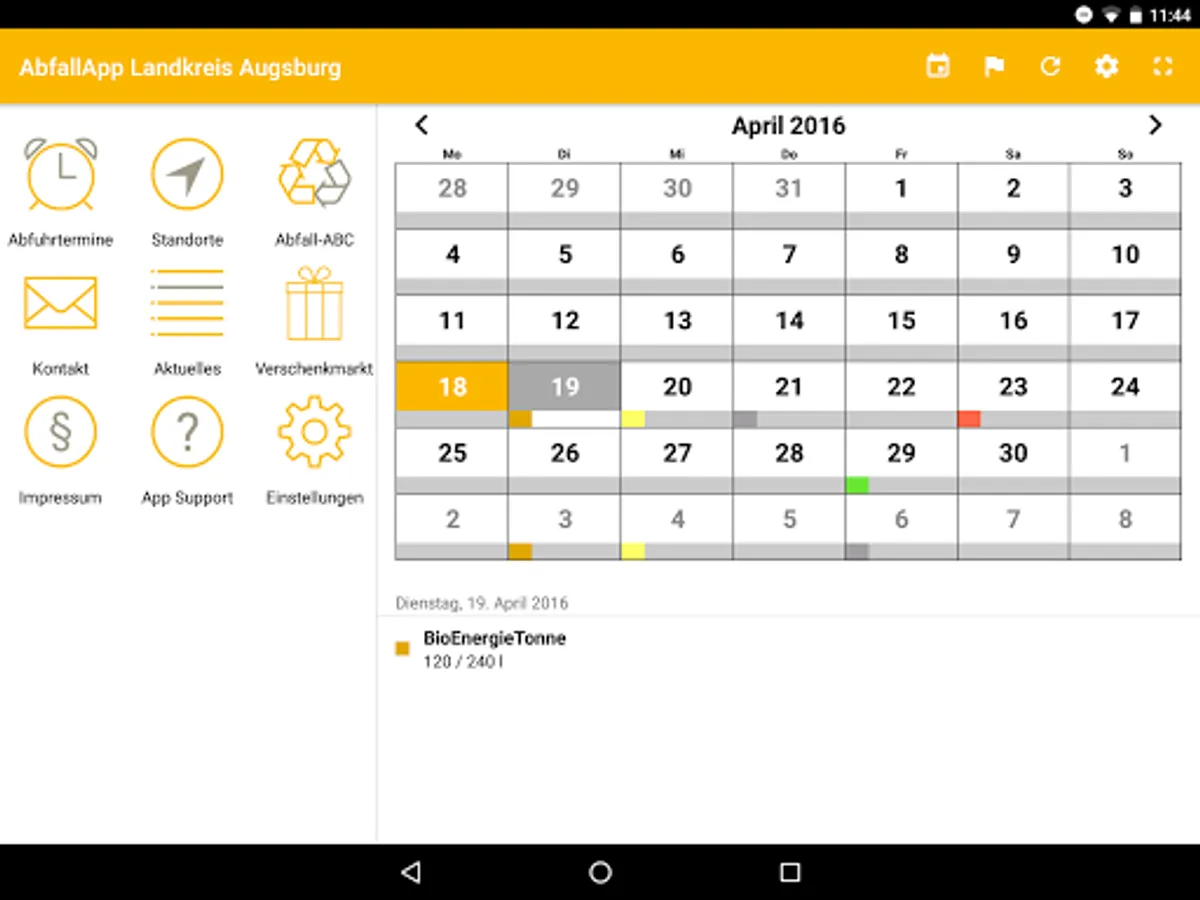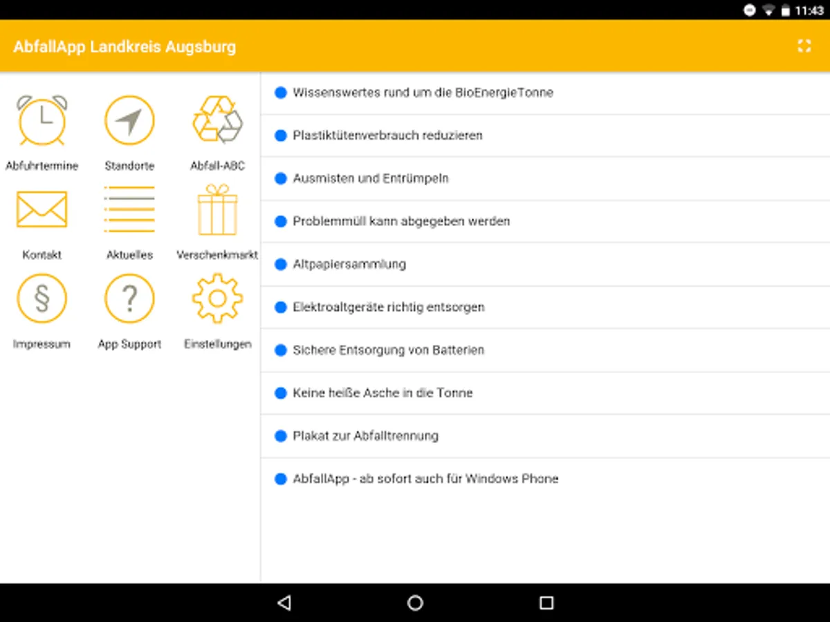 Residual waste, waste paper, organic waste - when is emptied that bin? With the free AbfallApp of the waste management operation, you have the garbage disposal always in view. You'll never miss a deadline emptying, because the AbfallApp reminds reliably to all removal dates in the district of Augsburg. Simply select a city, Memorial Day and adjust the time and off you go!