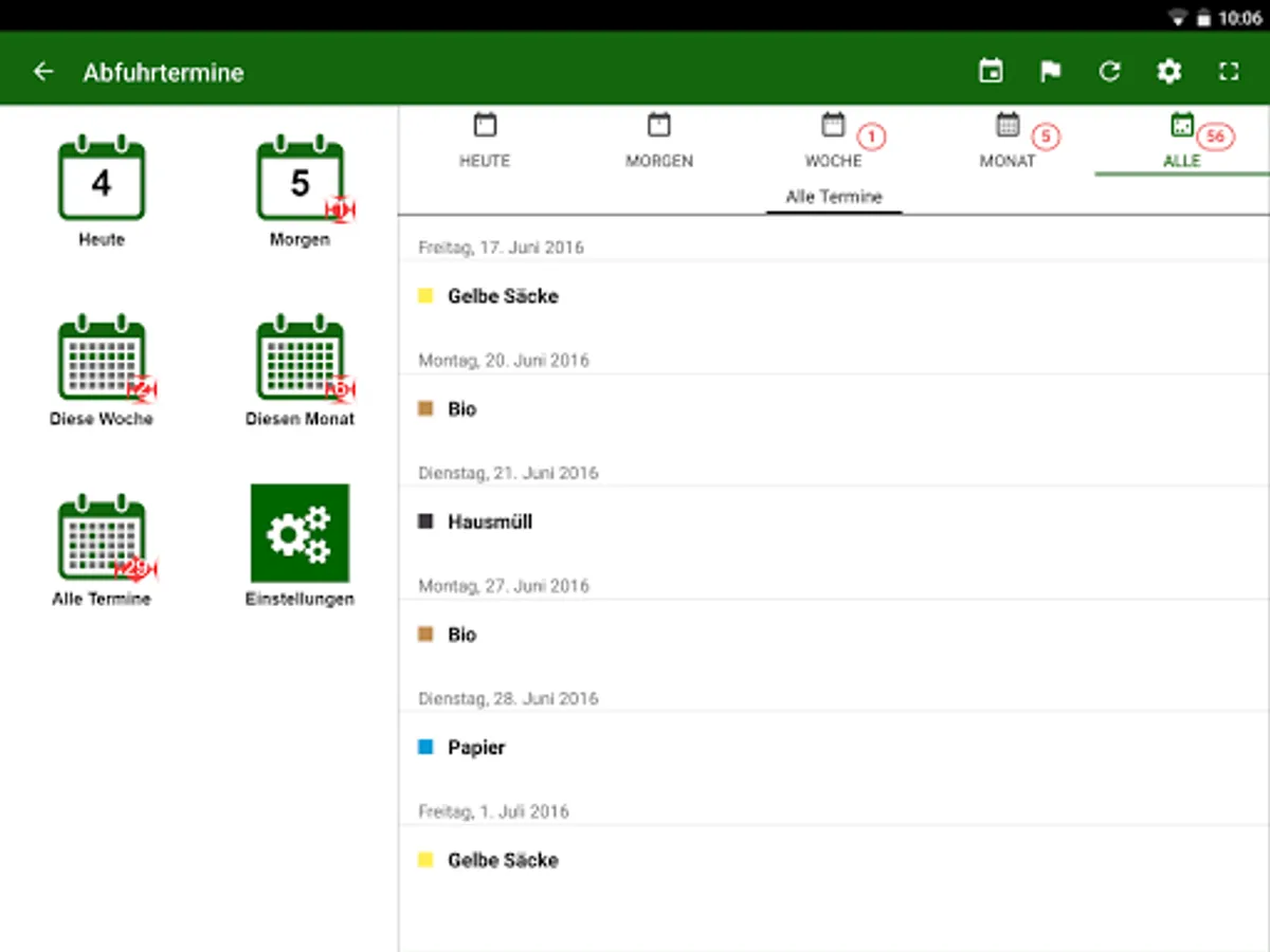 Have the respective discharge dates displayed for your place of residence or search easily and quickly for the next recycling center or the next glass container. With the help of the directions, these places can be quickly and easily located.