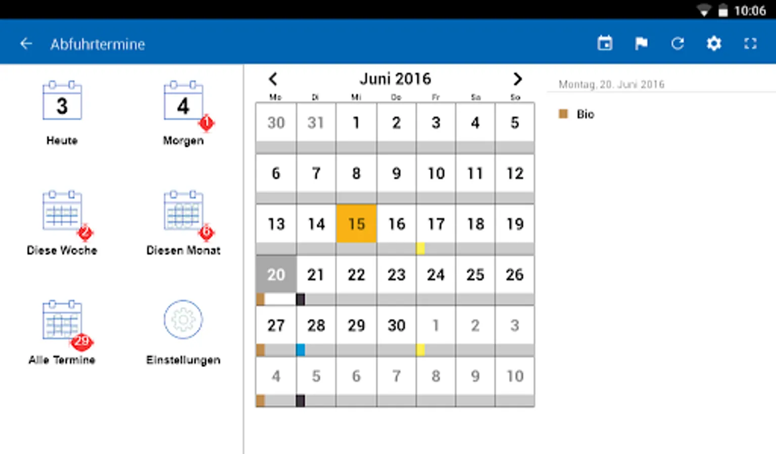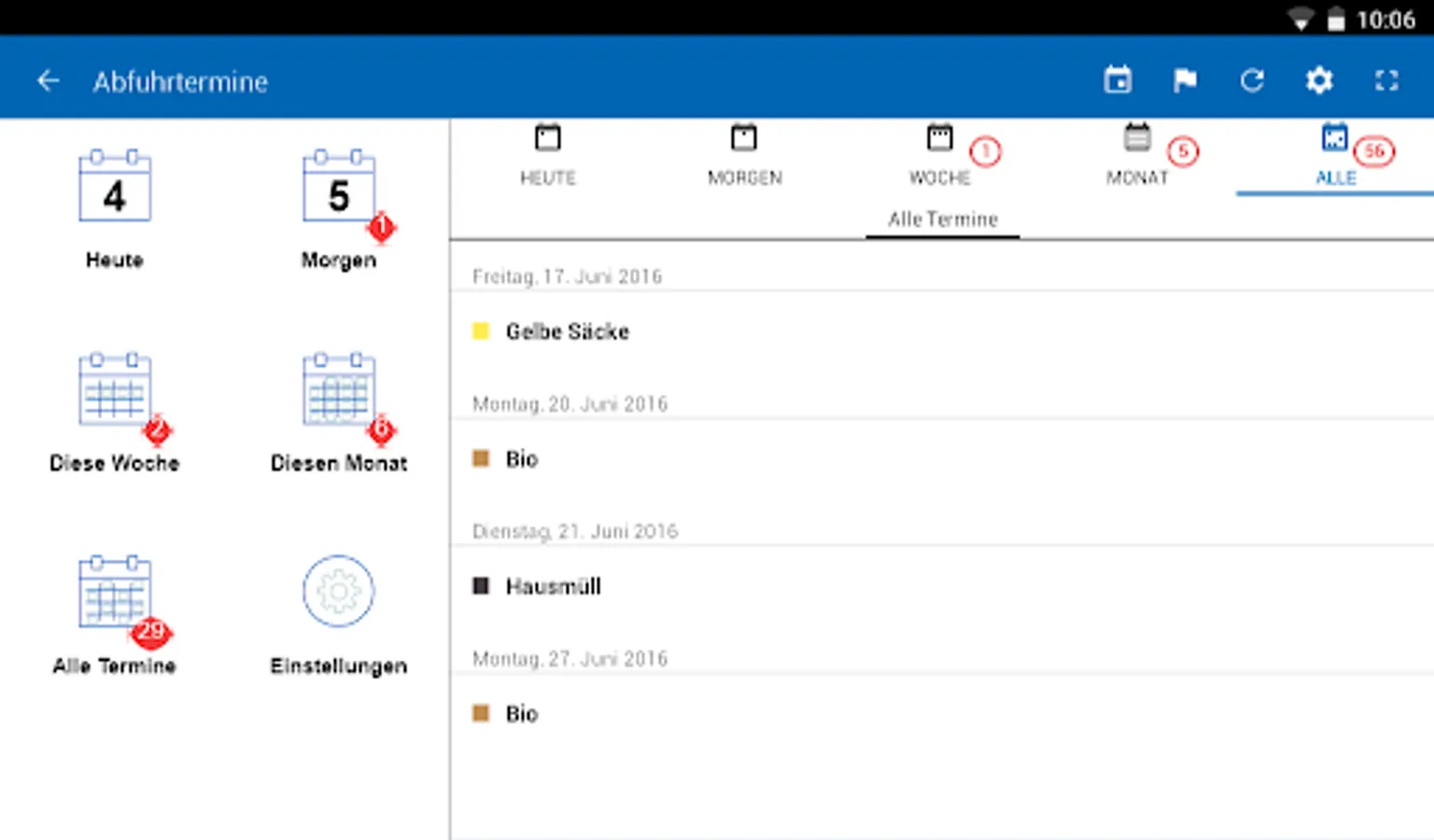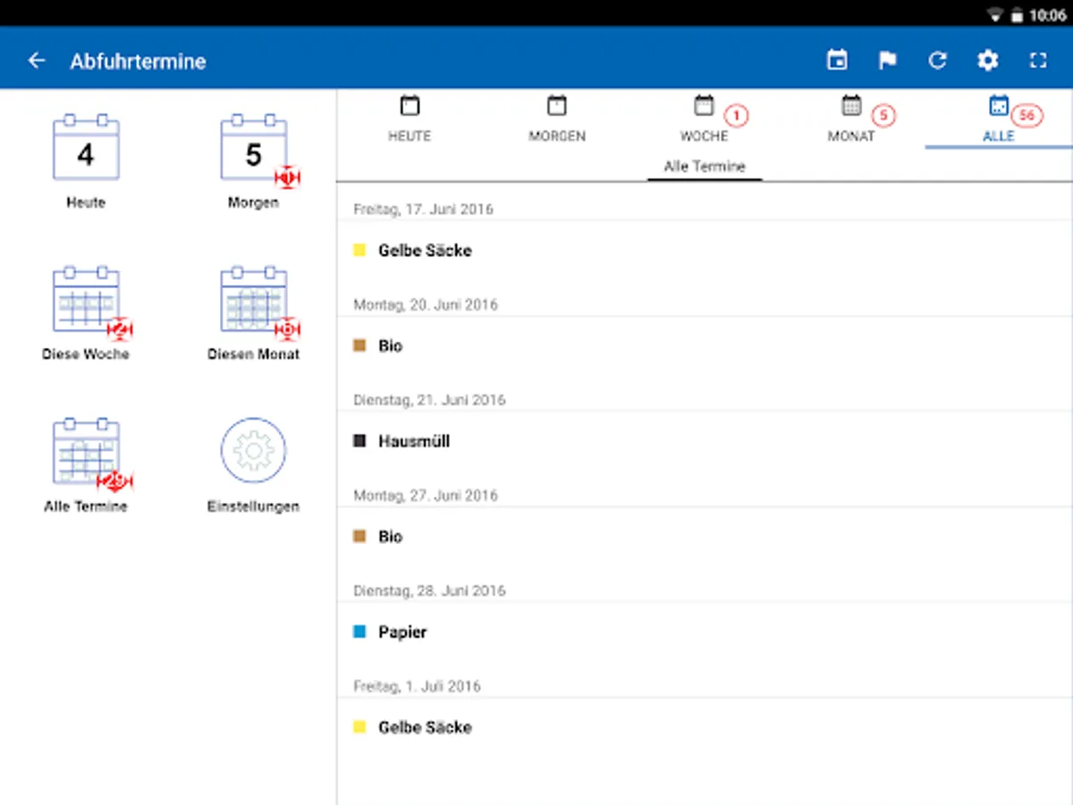 Download the app, install it on your device and register for free. For the reminder function, simply select your place of residence, set the reminder day and time and you will have an overview of all removals.