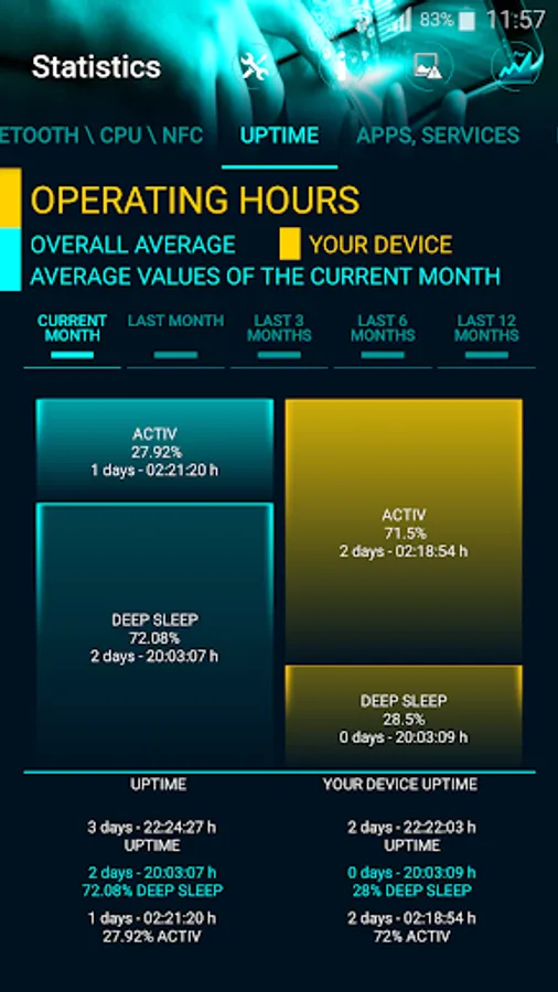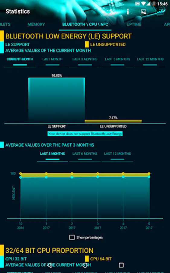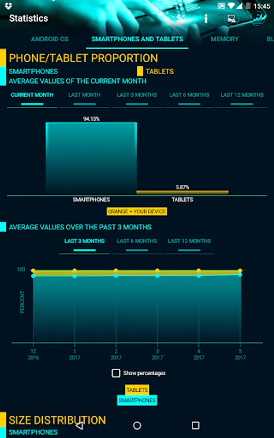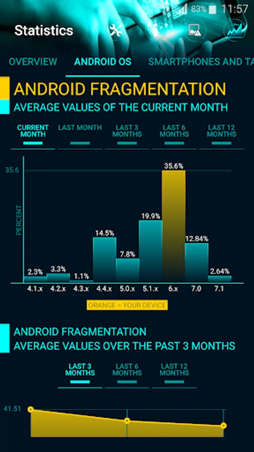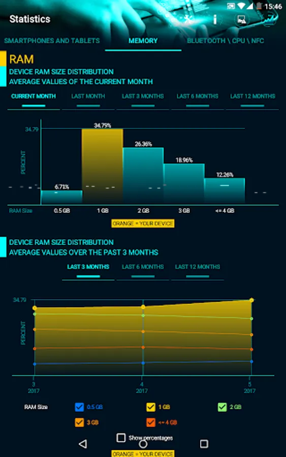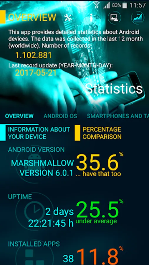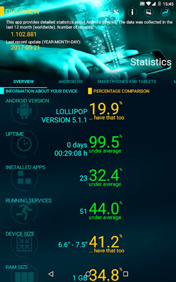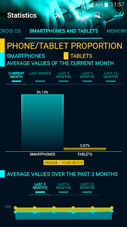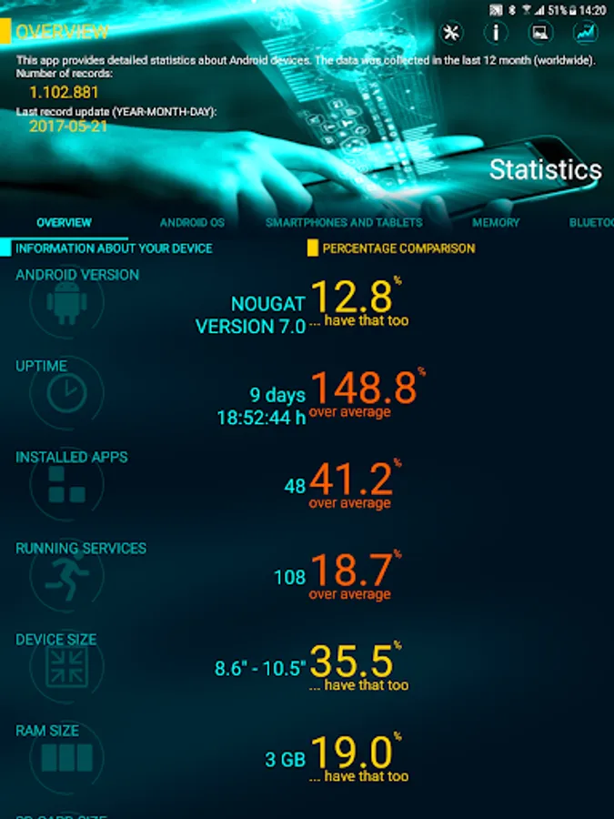 Statistics and Statistics Pro provide up-to-date and global statistical data of the last 12 months for Android smartphones and tablets, always compared to your device.