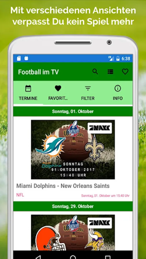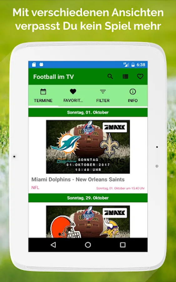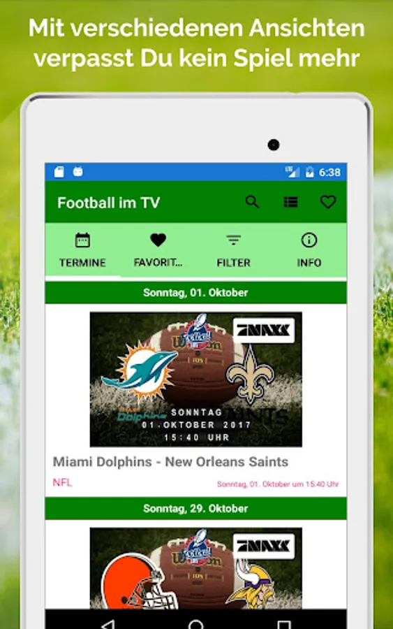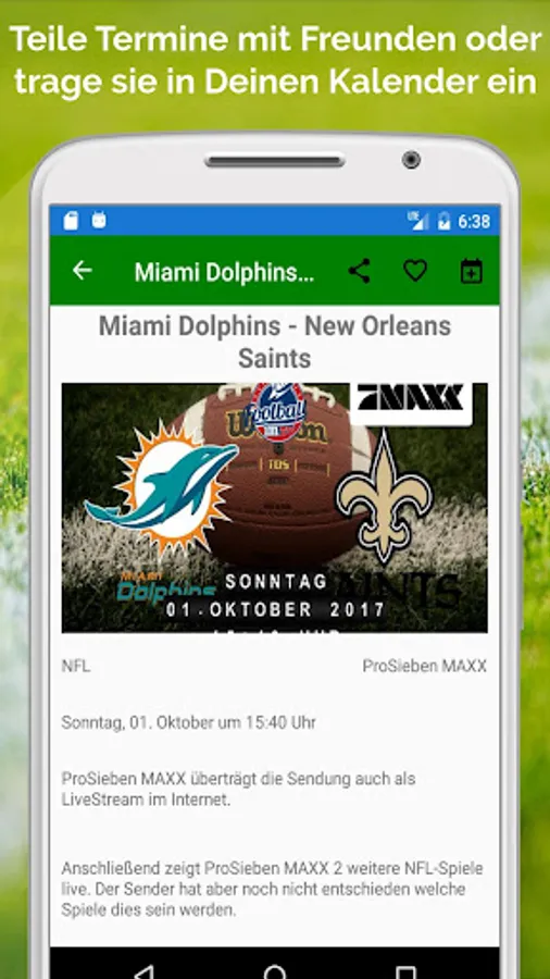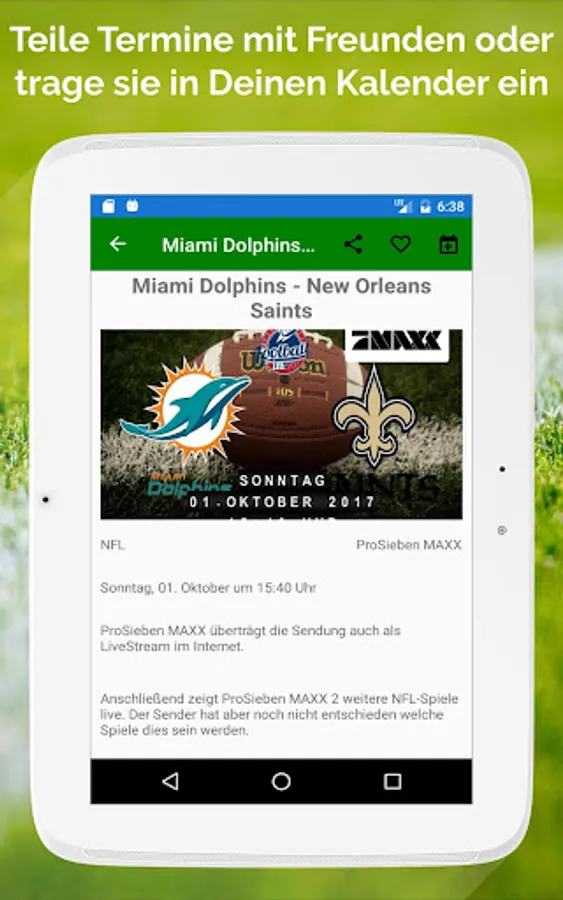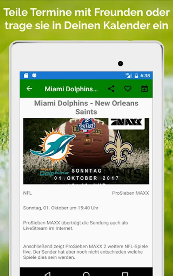 - Calendar entry. You can take a calendar entry in your personal calendar so you create your games do not miss a single click. Of course, with alarm in good time before the game.