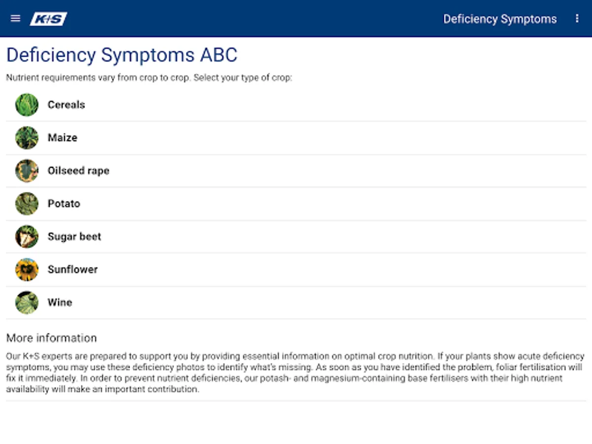 Benefit from the most important information about the use of mineral fertilisers. You can identify deficiency symptoms of your crops at any time and find useful information about plant nutrients, the products from K+S Minerals and Agriculture GmbH and their optimal usage.