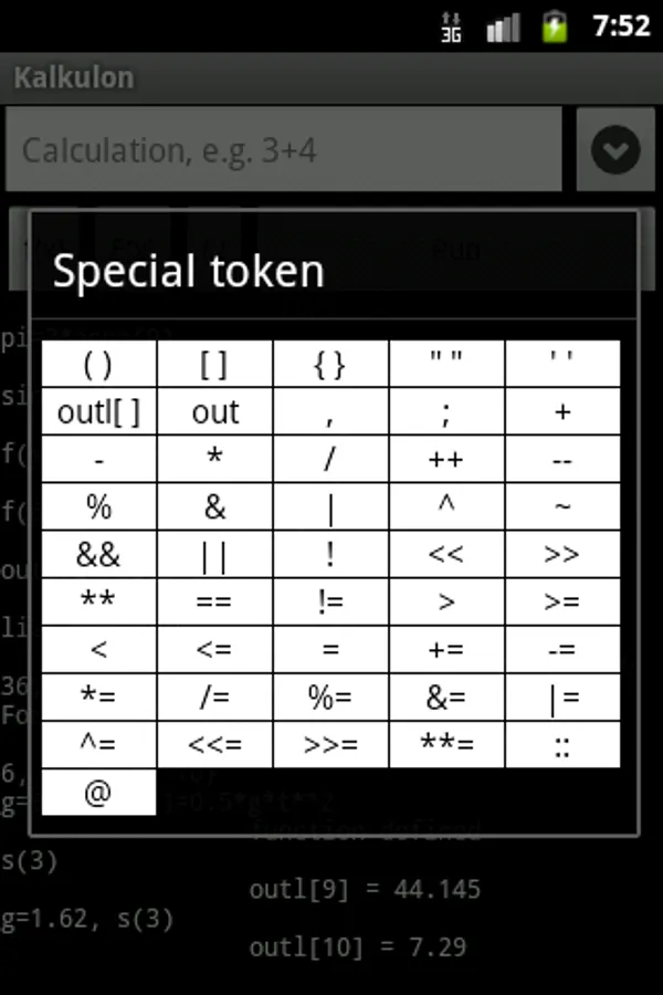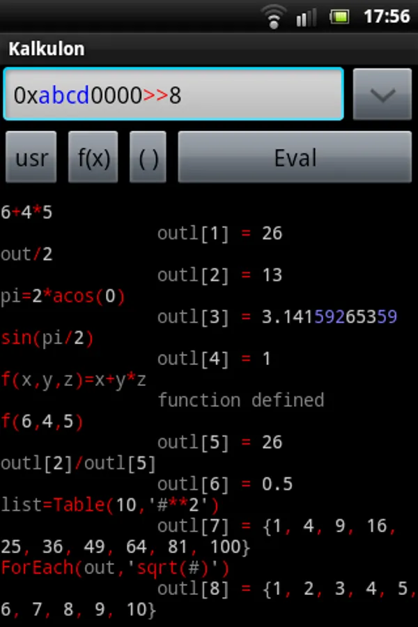 * result history (out, outl), e.g.: 3+4; out+8; outl[0]+outl[1]