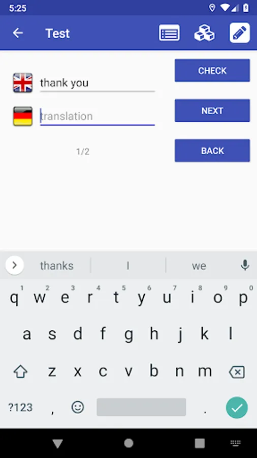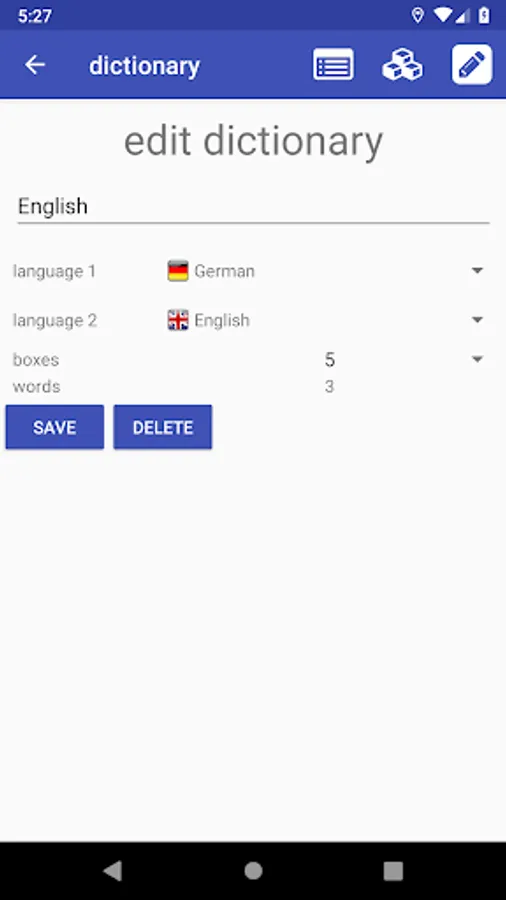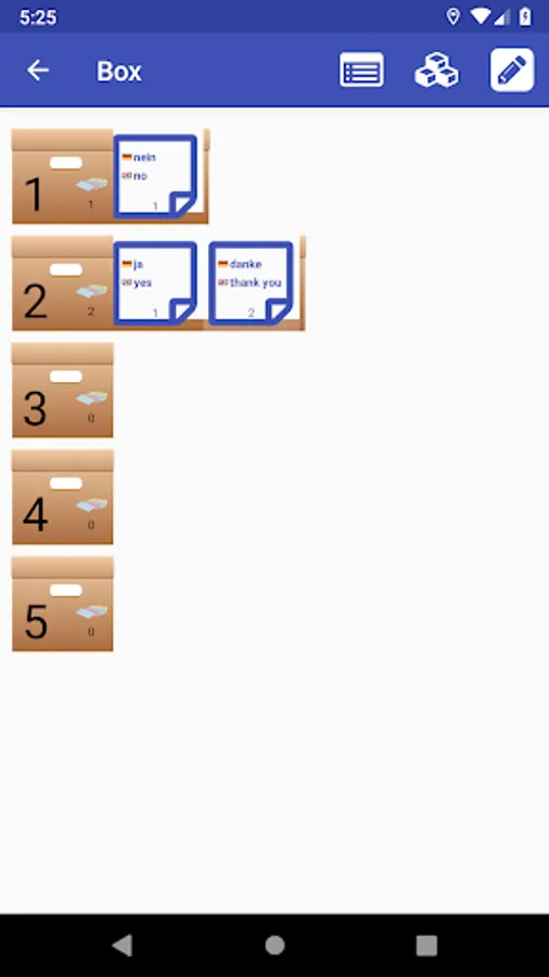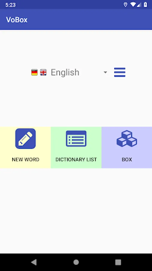 Create your own dictionaries and improve your vocabulary with integrated training and tests. You are learning a new language, reading a book with unknown words, preparing for an exam in school or you are on holiday abroad? VoBox organizes new vocabulary and places them in card boxes. Test yourself, for every correct answer the card is placed in a higher card box. Check your progress simply by the number of cards in each box. Create as many dictionaries as you like and configure their languages as well as the number of card boxes. With VoBox you can