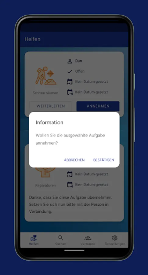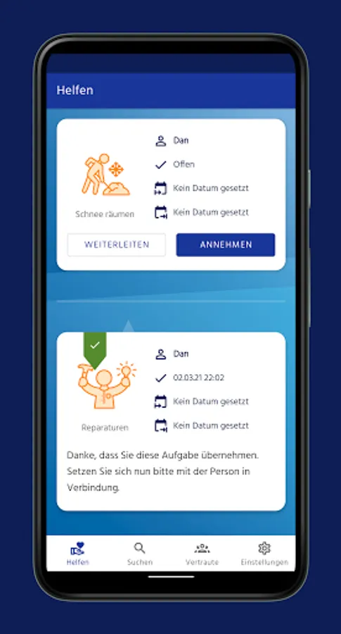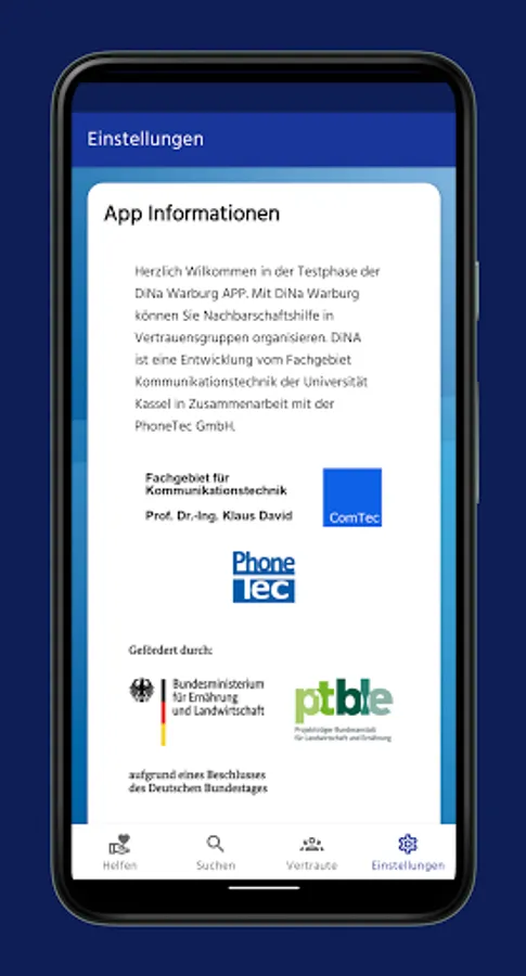 DiNa Warburg offers the possibility to search for and find neighborhood help very easily. Thanks to the new coordination mechanism, the request for help is created in seconds. My chosen neighbors, friends and relatives will be informed immediately about my request for help. Due to the simple and simple function, the operation is fun for young and old.