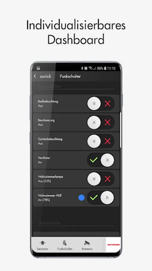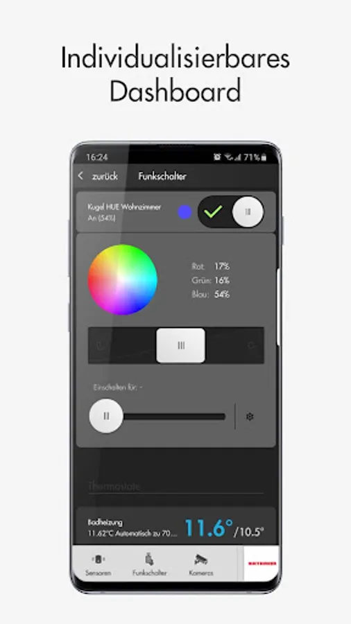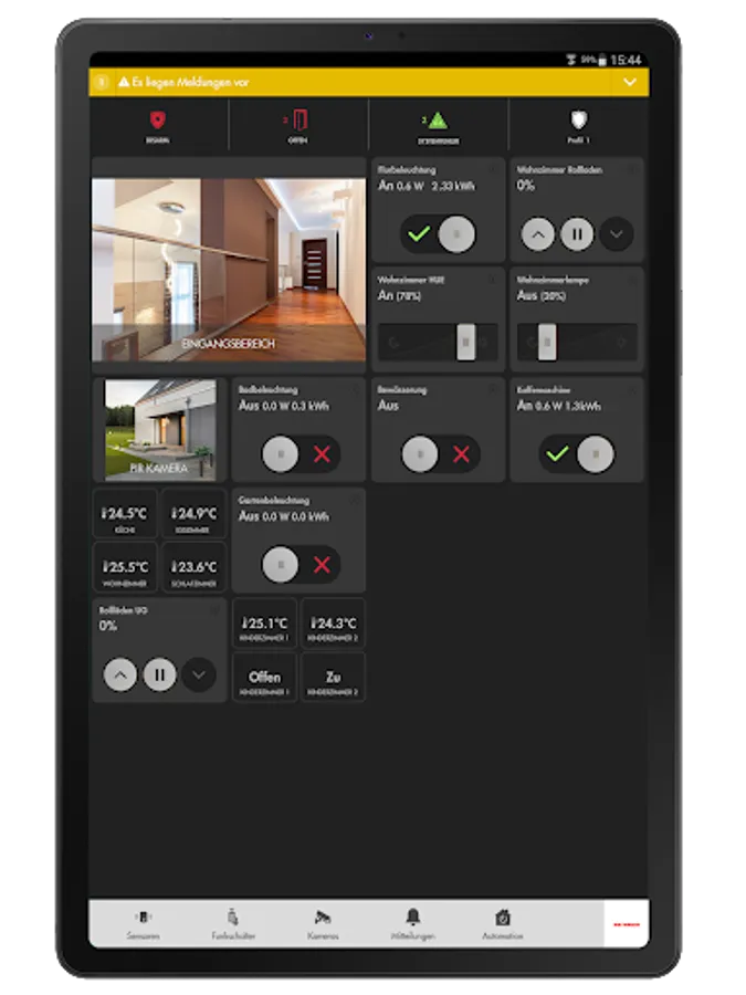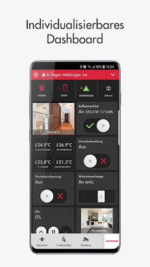 Being at home while on the road, that is the leading design principle of this app. The app is available for iOS and Android devices at no costs in the corresponding app stores. The KATHREIN app offers you all the important information you require at a single glance. The new home screen of the app – the dashboard – is completely adjustable to your individual needs. Hence, you have access to the information and functions you require (e.g. switches, cameras, temperature, humidity, etc.). The intuitive interface grants you access to all the functions of your system. Full screen push notifications guarantee that you are immediately informed about any occurrences at your home. The app supports every current KATHREIN products, such as alarm panel and IP-cameras.