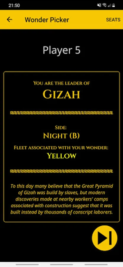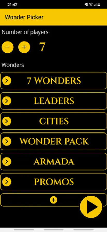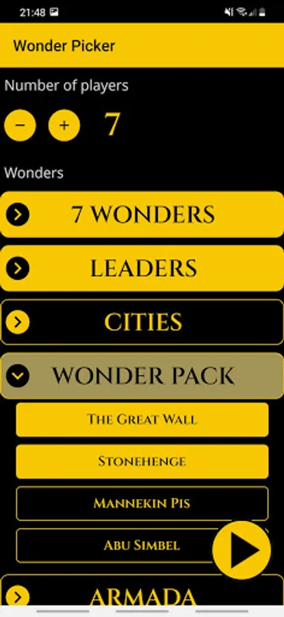 Wonder Picker is an app to accompany the board game 7 Wonders. The app helps you with setting up the game by randomly choosing a wonder and a tableau side for every player. In addition to that the app also lets you randomize the seat order around your gaming table to give everyone the same preconditions.