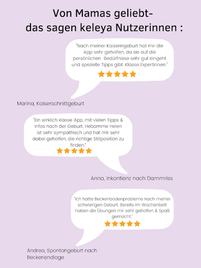 keleya Digital-Health Solutions GmbH accepts no responsibility for misuse of the app or its content. Using the app does not replace personal advice from a midwife or doctor, nor does it promise to alleviate the pain that can occur after childbirth. All information is provided for general information purposes only. If you have concerns about your health, consult a doctor.