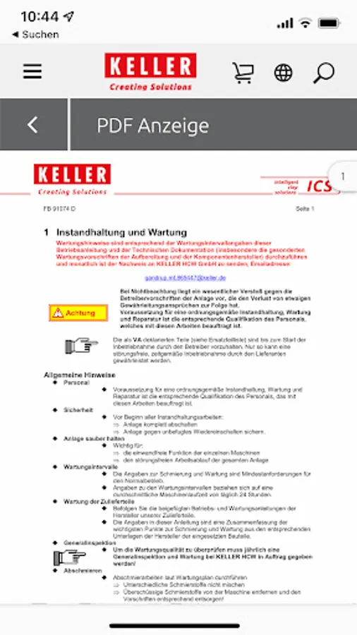 Customer service has never been faster and easier. With our service app, you have quick and easy access to your individual machine and plant documentation, the possibility to call up service information, request spare parts, communicate comfortably with us and exchange documents at any time and from any place via your tablet or smartphone. To do this, use the new Service App of KELLER HCW. This is service in completely new dimensions.