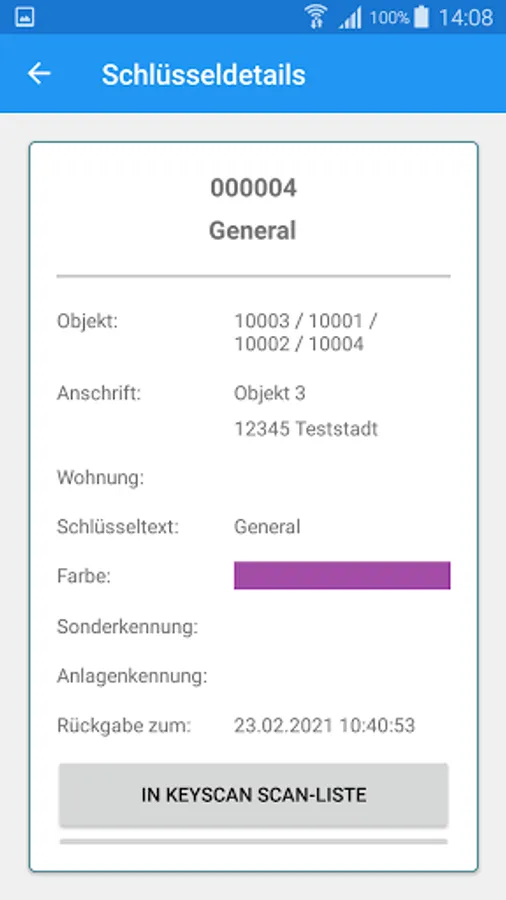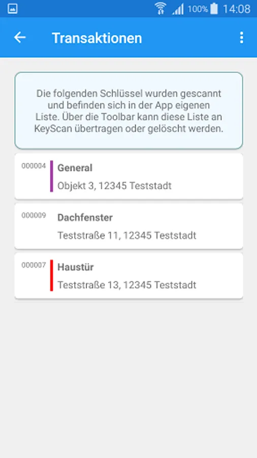 The printed barcodes can be scanned with the app. This shows all important key information and allows further communication with the KeyScan software.