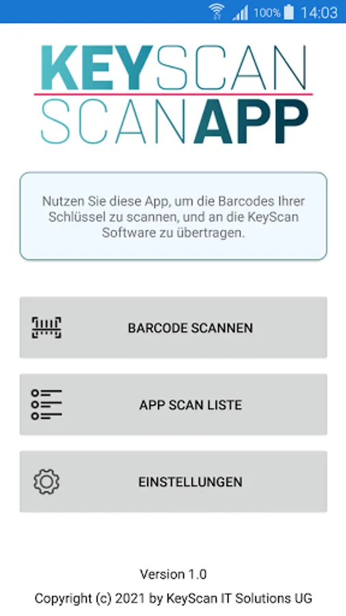 The KeyScan ScanApp serves as a scanner for the barcodes of the KeyScan key management software and thus replaces the usually required barcode scanner (USB device). The prerequisite is the use of KeyScan from version 5.10.