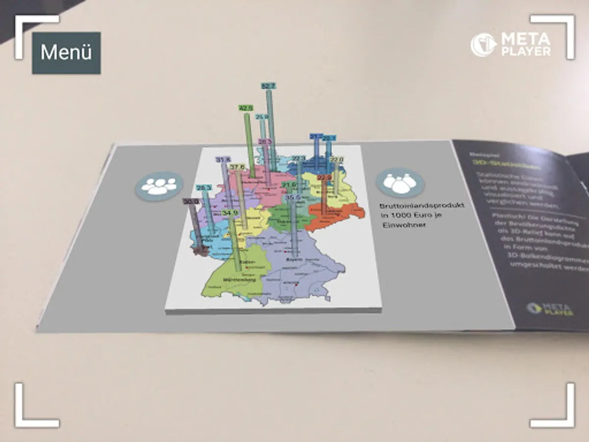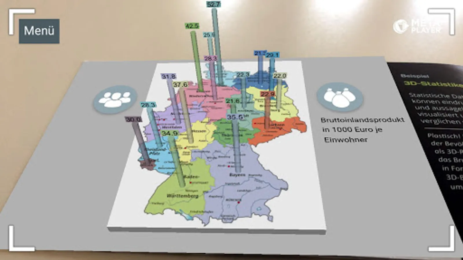 With the help of augmented reality technology, the MetaPlayer app connects the real with the digital world, thus expanding printed products, images, exhibition walls, machines, devices and exhibits etc. with interactive content.