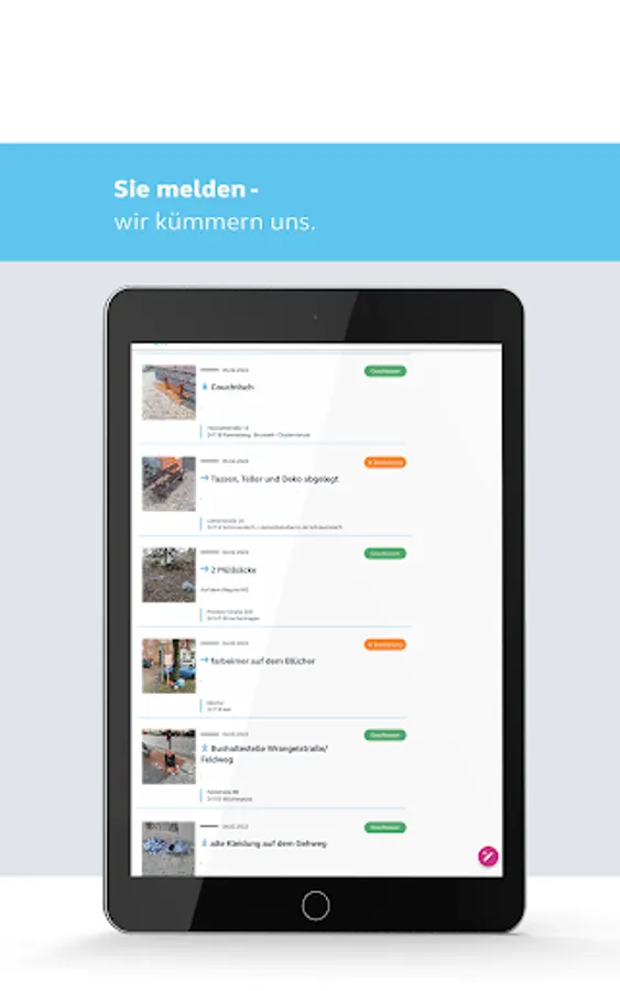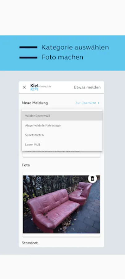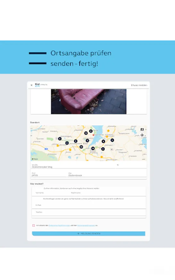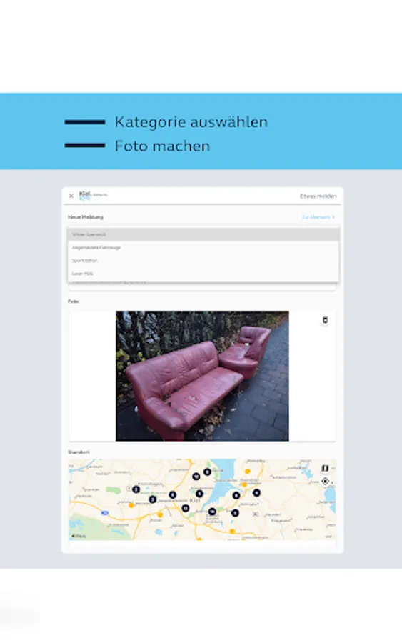Select a category, take a photo, check the location, send - done!