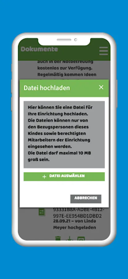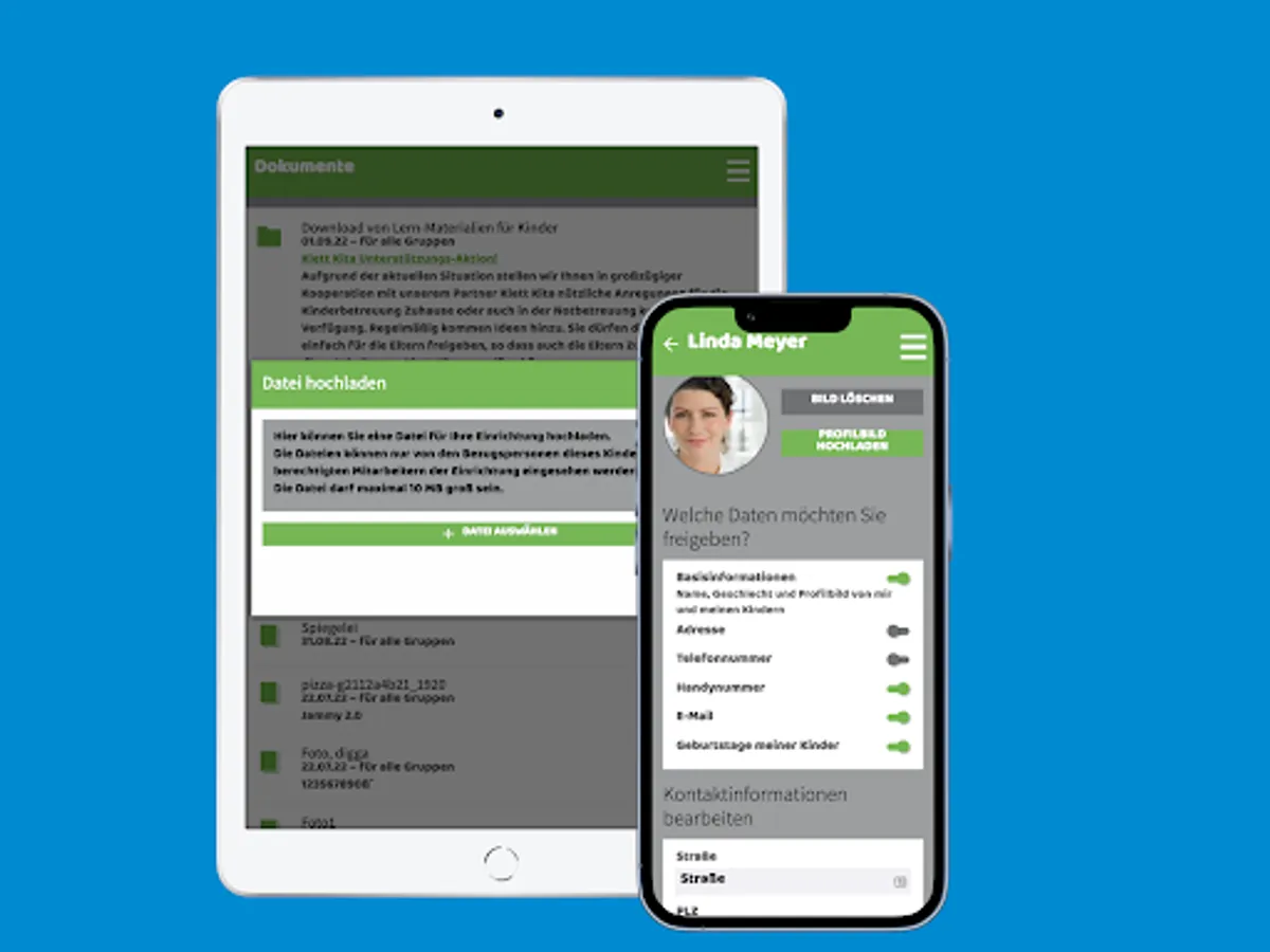 An integrated data exchange folder enables you to exchange documents or photos of any kind with the kindergarten - and vice versa. We attach particular importance to security and GDPR-compliant storage: All data generated in the system is stored in a German data center.