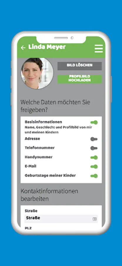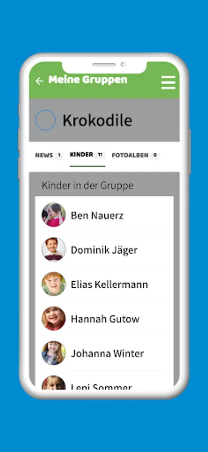 The existing address book enables you to conveniently contact other parents in the group, your child's carers or the management directly. You can also upload profile pictures for your child and for yourself and specify which of your contact details should also be visible to other parents.