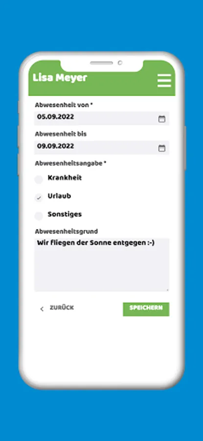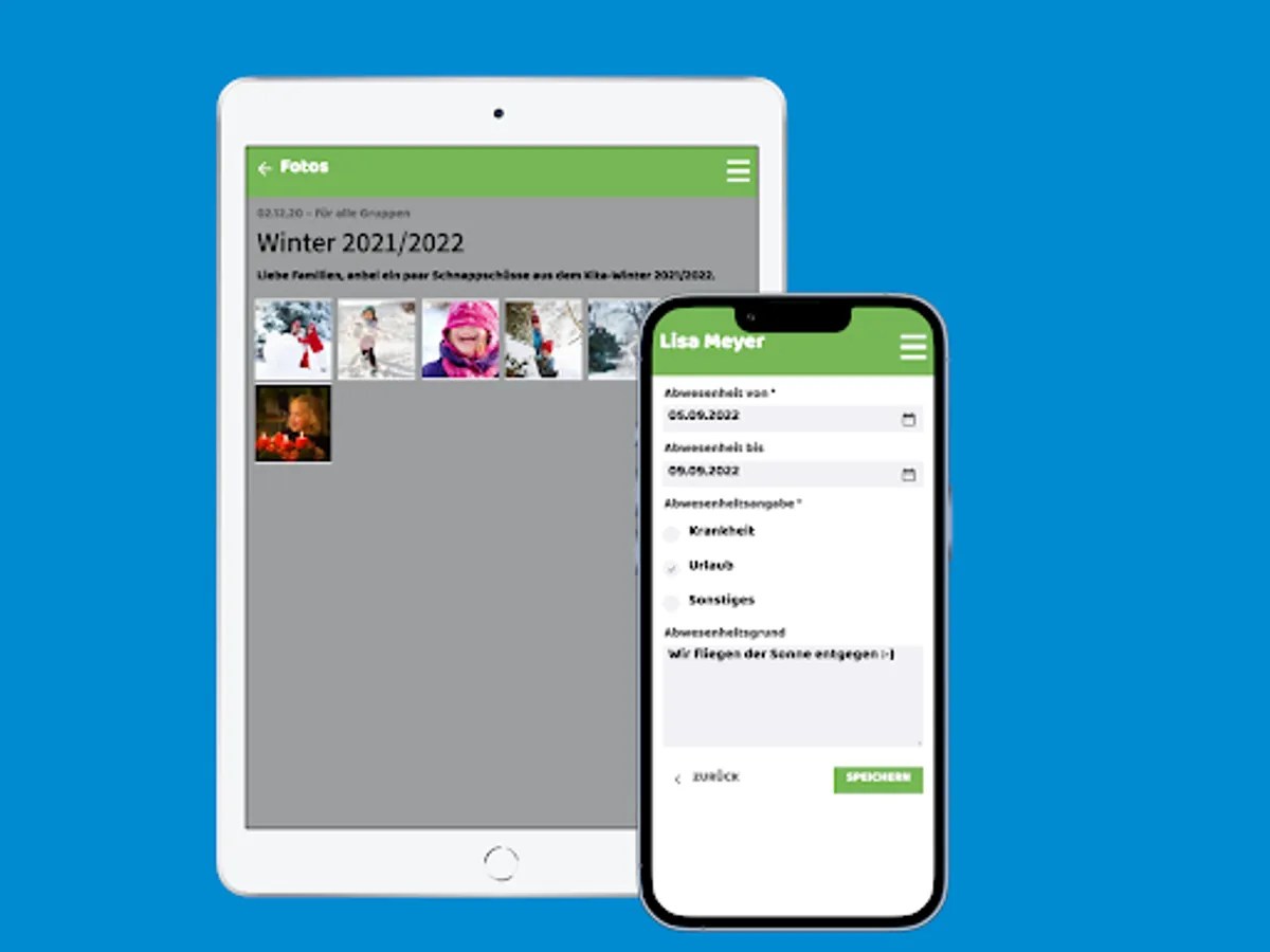 For example, if your child If, for example, you cannot go to the kindergarten due to illness, you can simply and conveniently inform the kindergarten teachers of this using the app's integrated absence function.