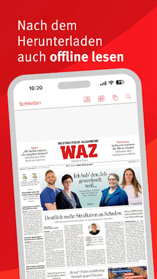 In your e-paper app you can read all local editions of your WAZ, including those from other regions, such as WAZ Bochum, WAZ Witten, WAZ Duisburg or WAZ Herne.