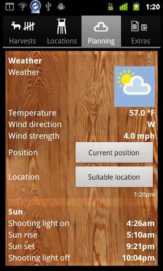 Weather and Solunar Periods. Check the weather forecasts, wind and temperature, moon phase, sunrise and sunset. With this research, you can map it to your locations and stands, which are suitable for this hunting day.
