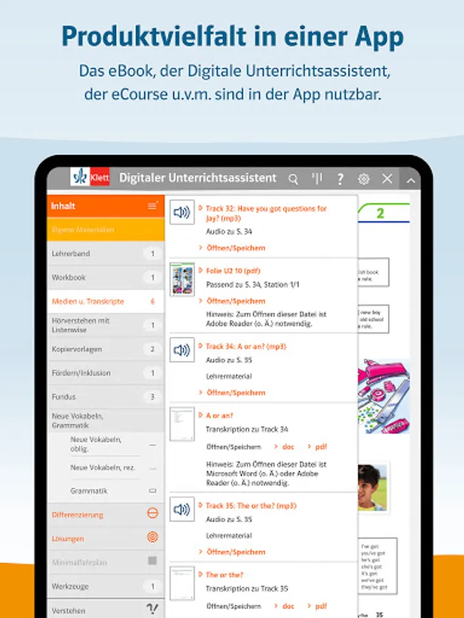 The following products can be used in the app: eBook, digital teaching assistant, eCourse, media for the student book and workbook.