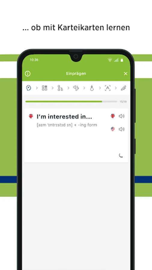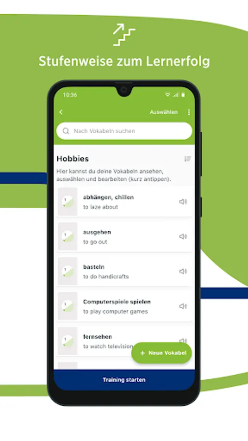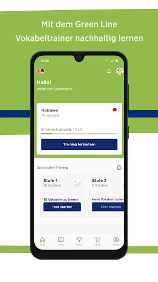 Do you learn vocabulary but forget it after a while? Then get the Green Line vocabulary trainer on your mobile phone. With this app you can train your vocabulary anywhere - even completely offline. With its scientifically based 7-step model, you will learn your vocabulary bit by bit and spread over a longer period of time until it is guaranteed to stick in your memory. The app uses an intelligent algorithm to automatically remind you when vocabulary is ready for repetition.