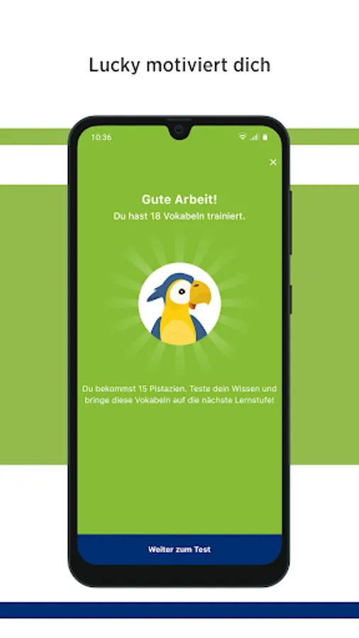 The training is clearly divided into the phases of memorizing, practicing and querying. Different exercises make learning varied and you always get feedback and tips from Lucky, the parrot with a talent for languages. There are also clear learning statistics that you can use to keep an eye on your performance.