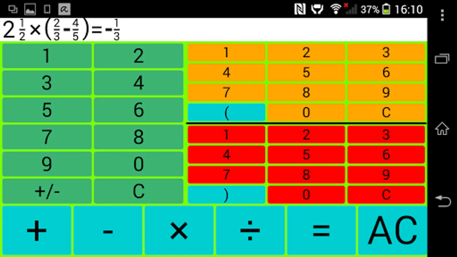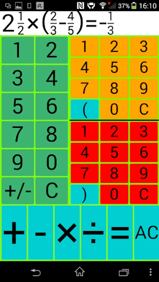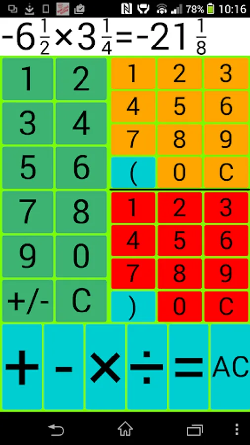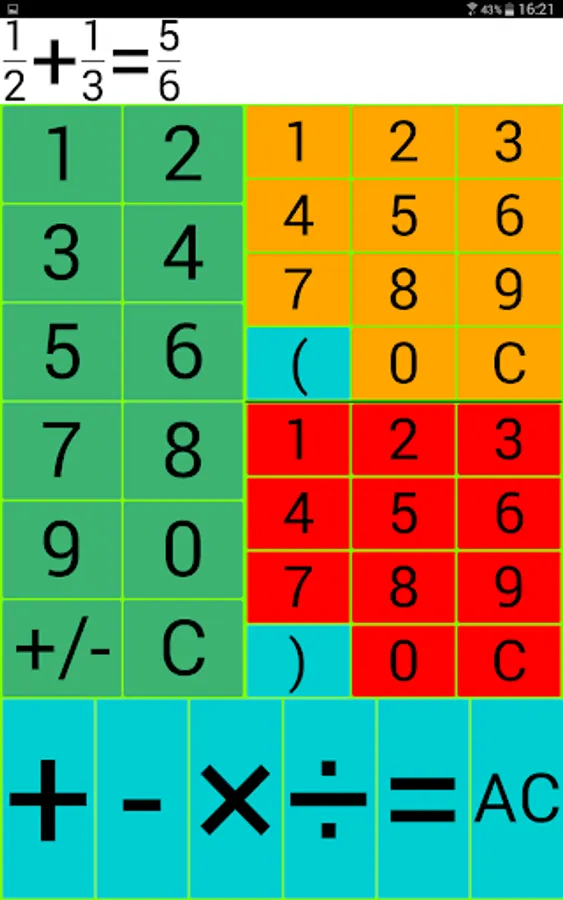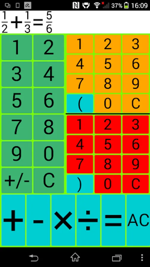 Input: The left green number field is intended for entering integers, the upper right for the input of a counter and the bottom right number field to enter a denominator.