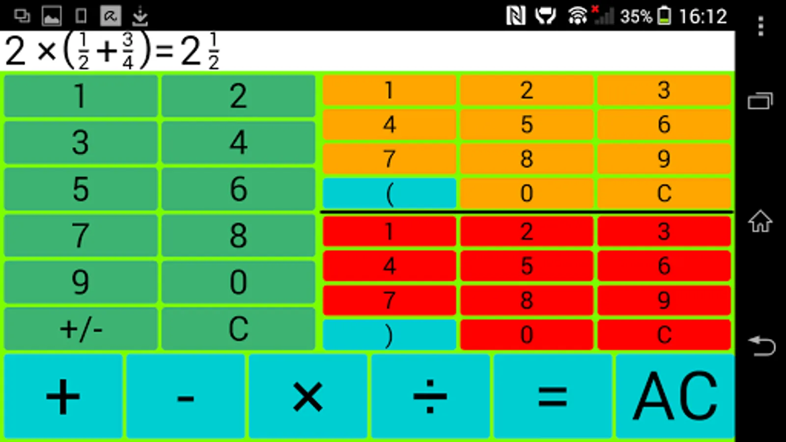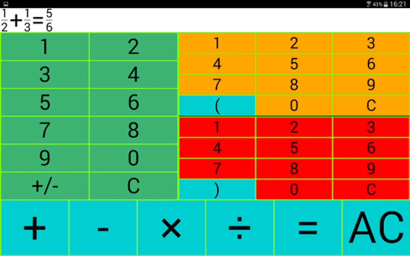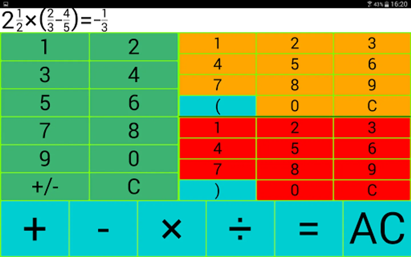 Input: The left green number field is intended for entering integers, the upper right for the input of a counter and the bottom right number field to enter a denominator.
