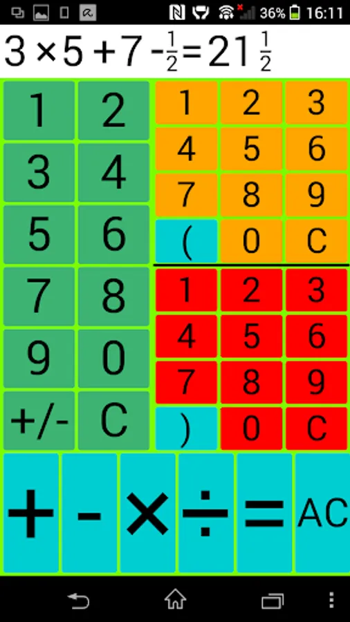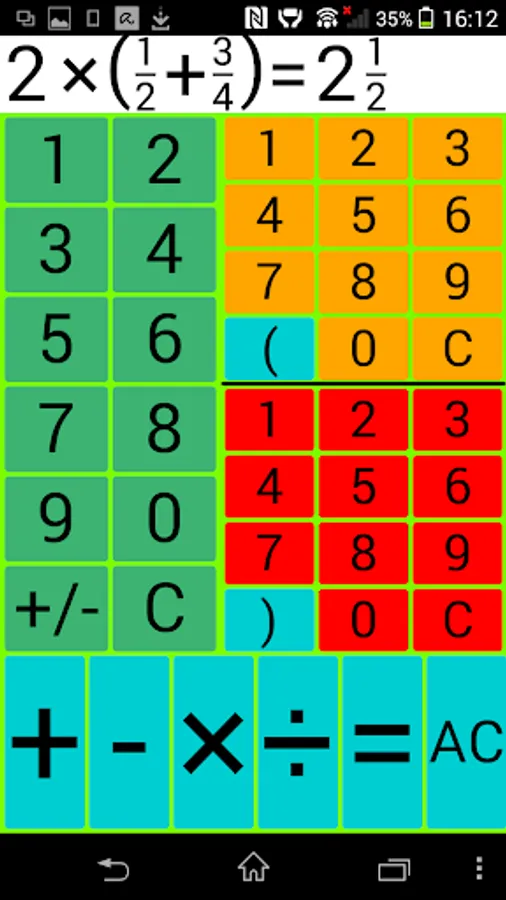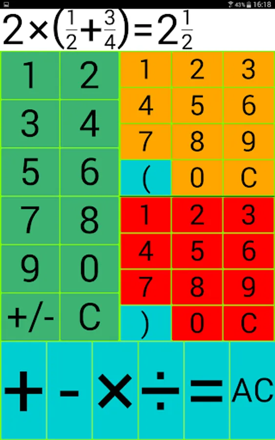 Example: The entry of 3 2/7 is done by typing in the 3 on the left panel, the 2 on the upper right and the 7 on the lower-right field.