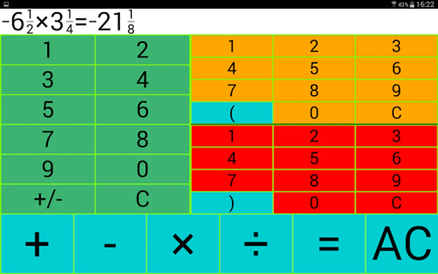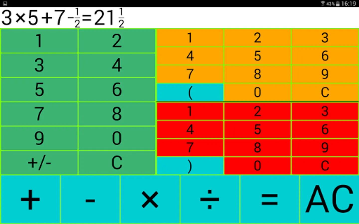 The entered calculation expression together with the result appear by tapping the equal sign.