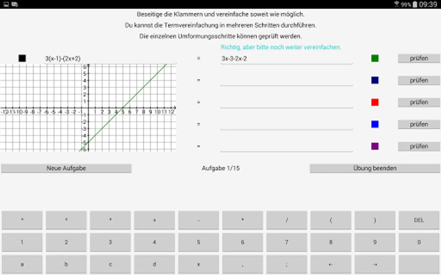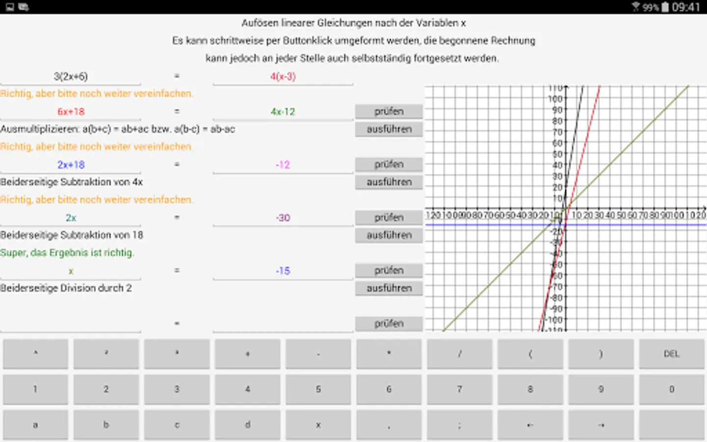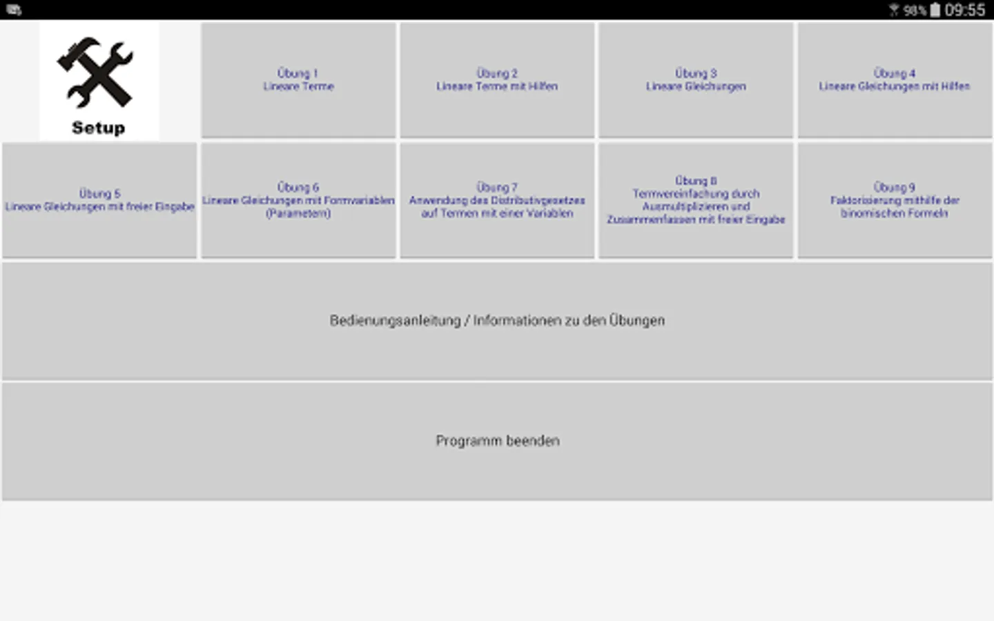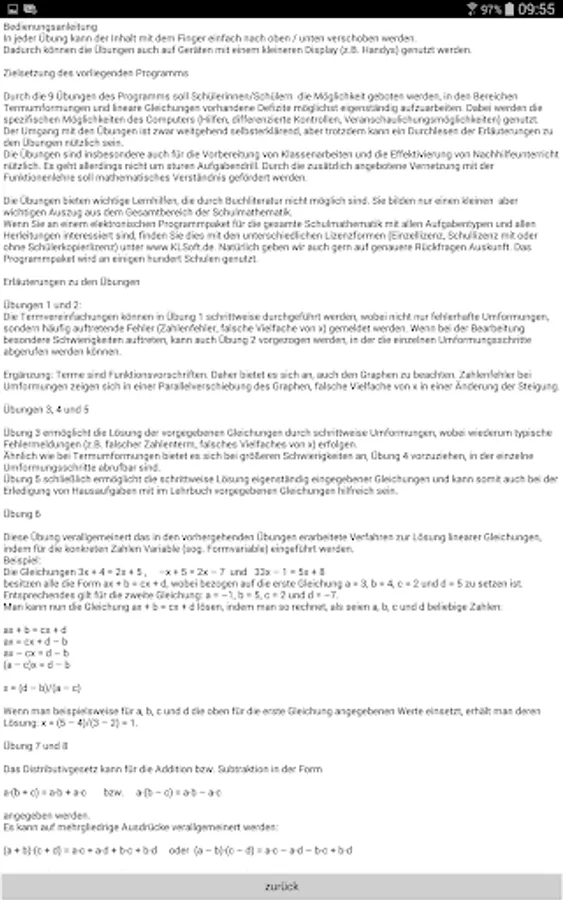 By 9 exercises of the program to pupils / students are given the opportunity, term transformations and linear equations work up as independently as possible in the fields of existing deficits. The specific capabilities of your computer (aids, differentiated controls, illustrating ways) are used.