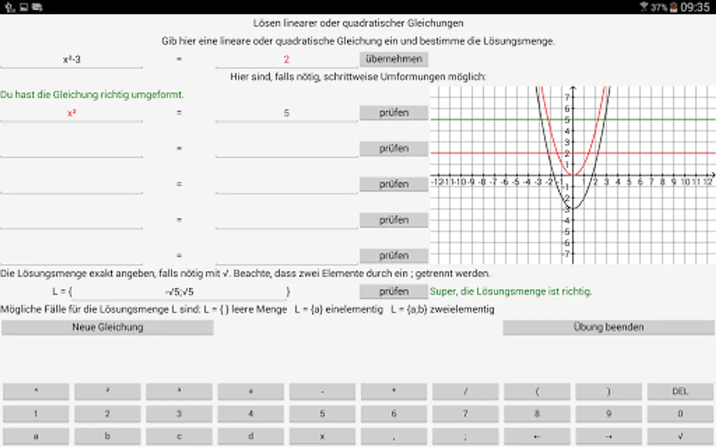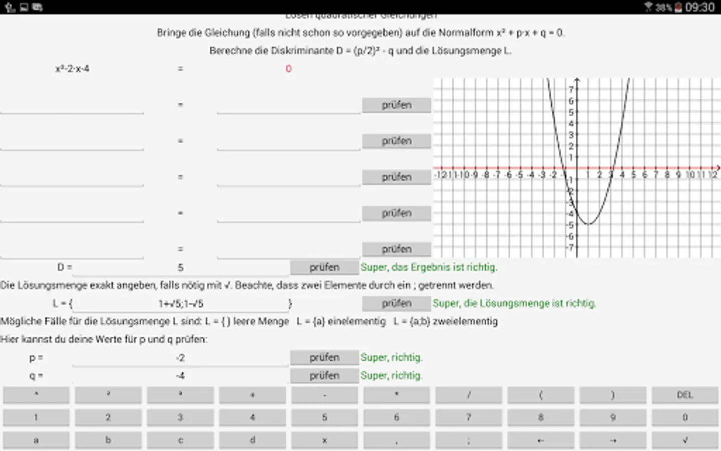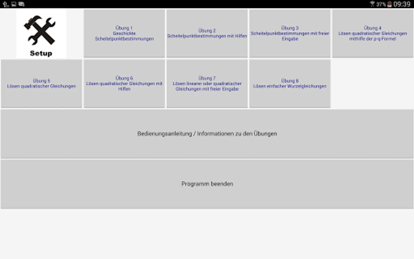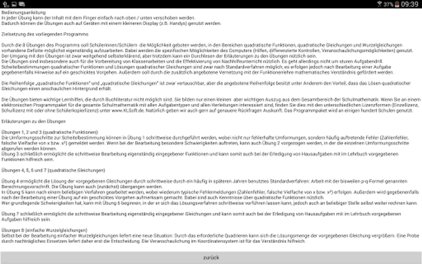 By 8 exercises of the program to pupils / students are given the opportunity, quadratic functions, quadratic equations and root equations work up as independently as possible in the fields of existing deficits. The specific capabilities of your computer (aids, differentiated controls, illustrating ways) are used.