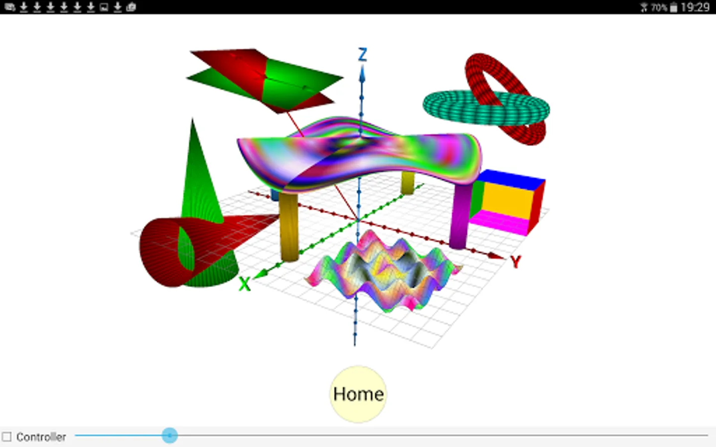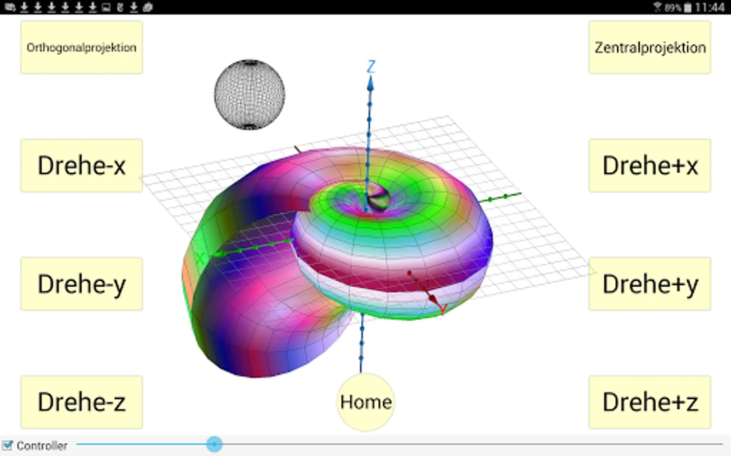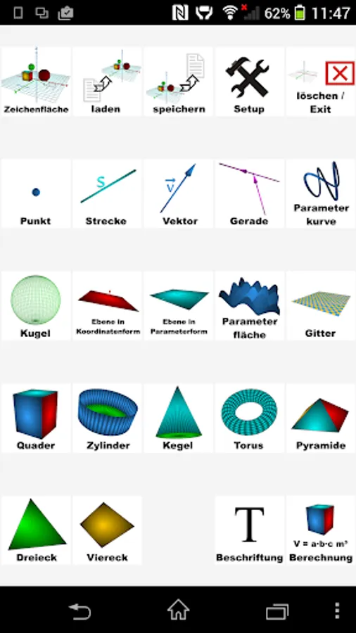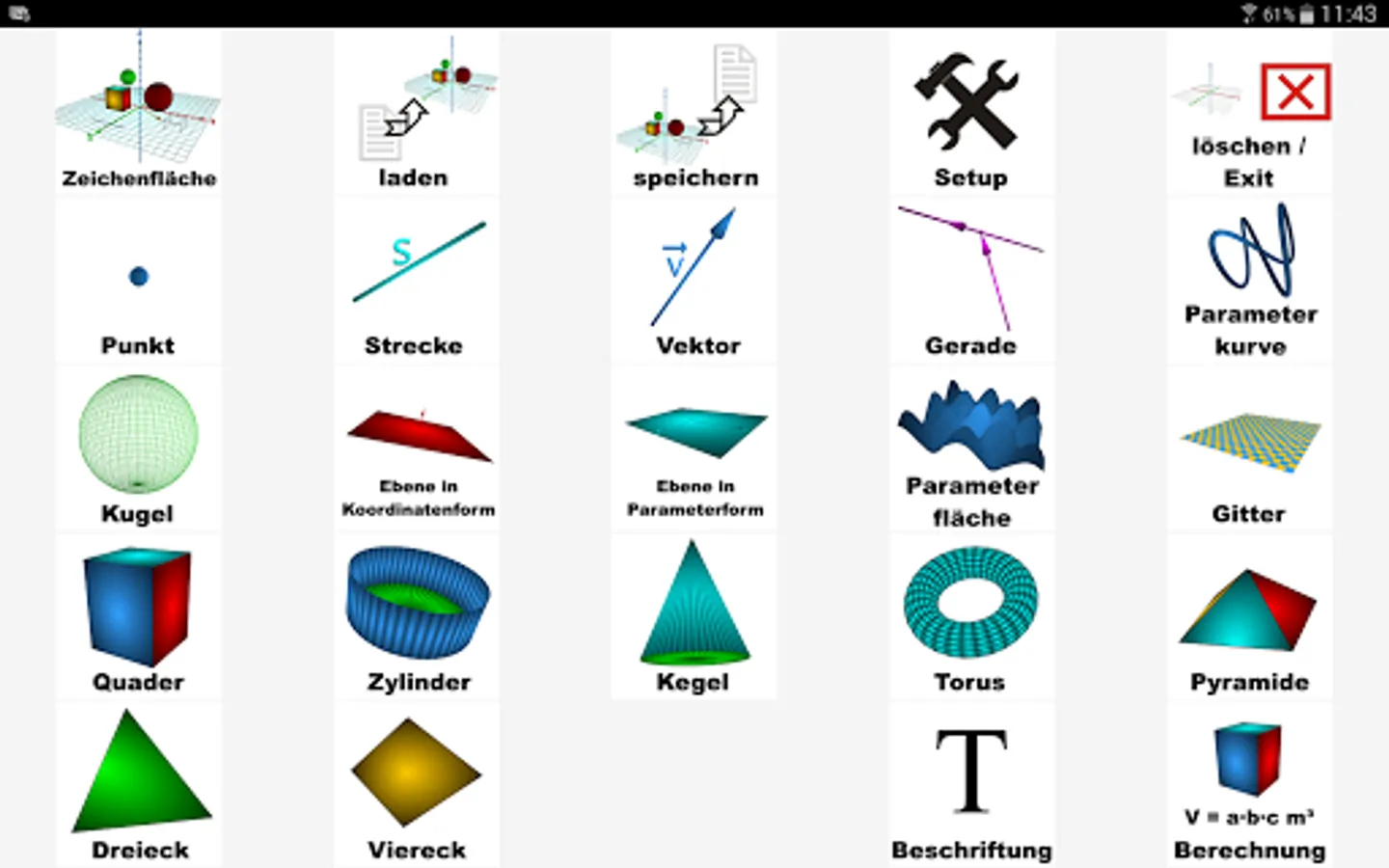 3D design tool for the representation of triangles, planes, lines, cones, spheres, parameter space, parametric curves, segments, vectors, rectangles, cylinders, pyramids, lattices.