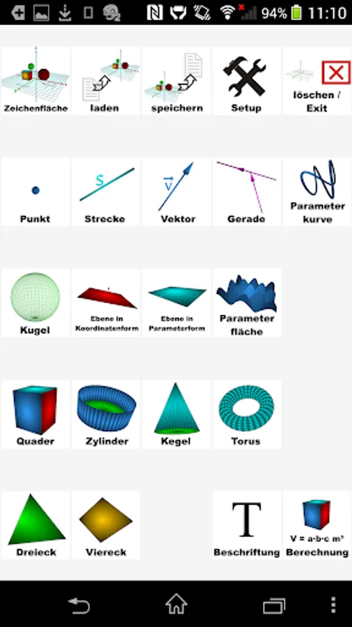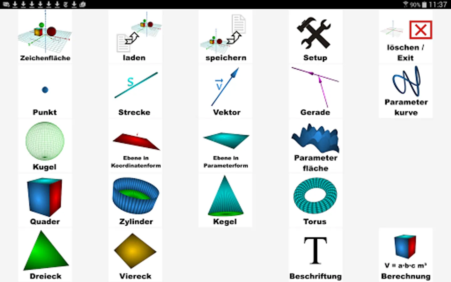 3D design tool for the representation of triangles, planes, lines, cones, spheres, parameters surfaces, parametric curves, lines, vectors, rectangles, cylinders.
