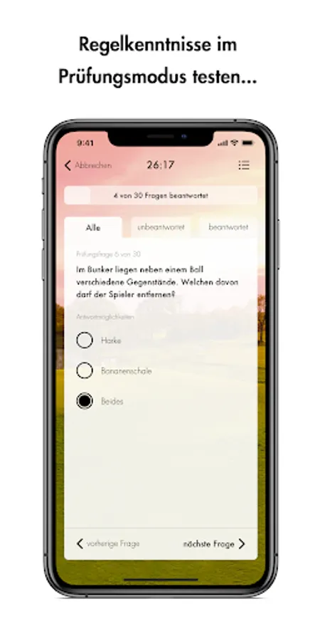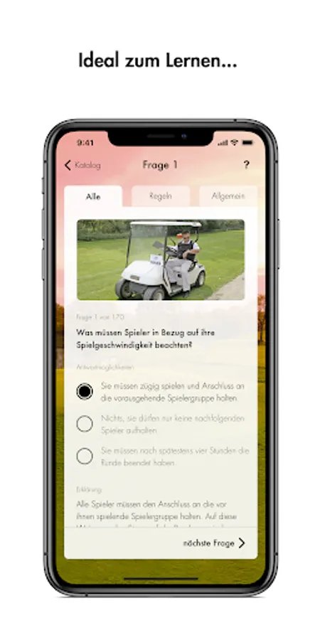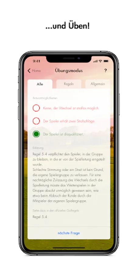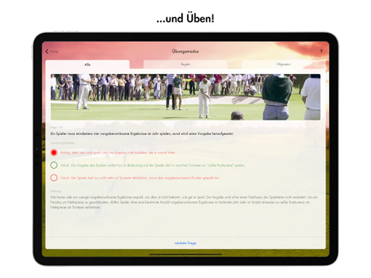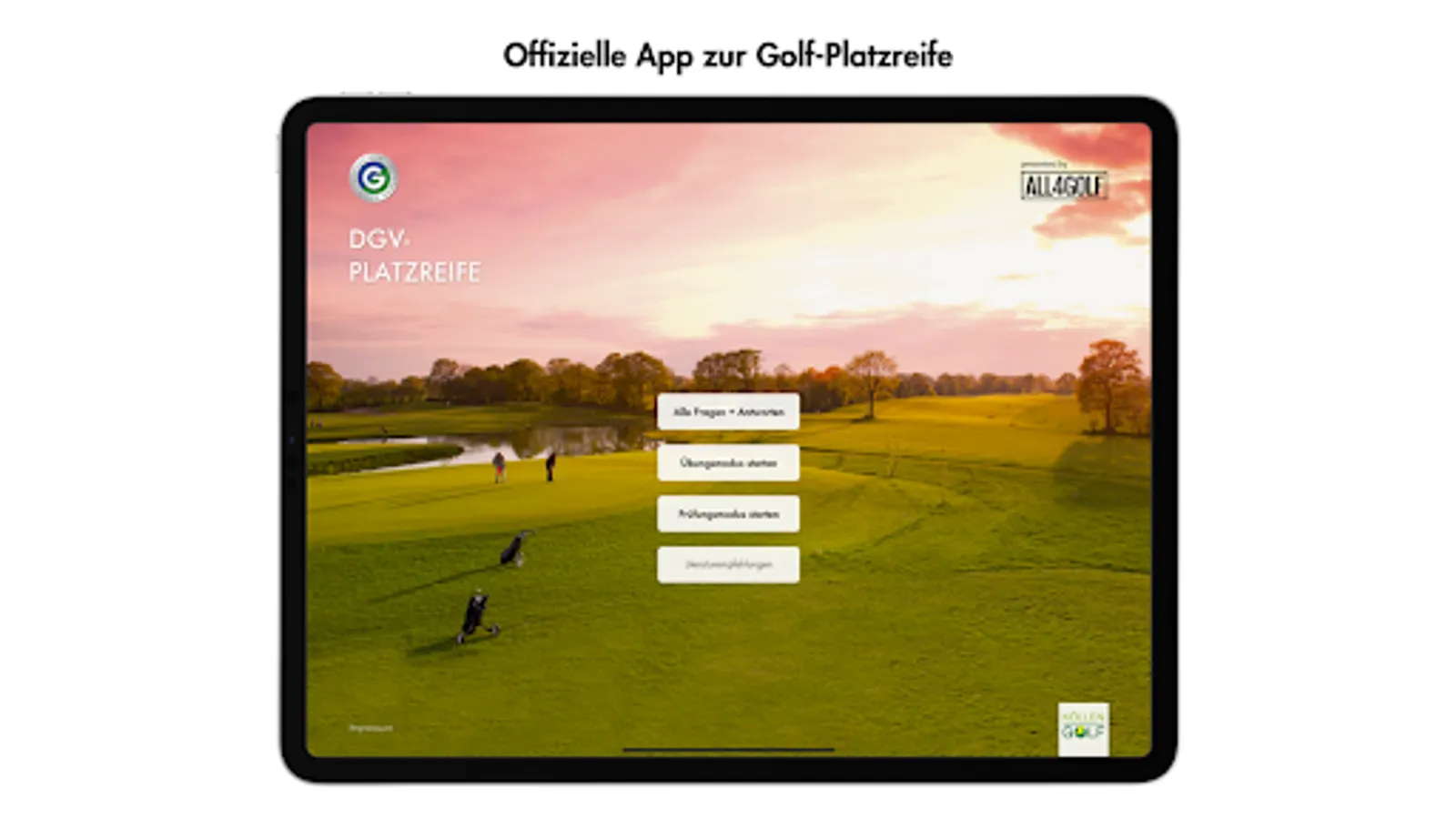 The DGV handicap app is presented to you by All4Golf. The long-standing partner of the German Golf Association e.V. (DGV) and presenting partner of the German Golf League (DGL) is at your side when you get started in golf with attractive offers and a huge selection of golf items. In the DGV Platzreife app, All4Golf offers you immediate discounts on your next purchase if you successfully pass the exam mode and after correctly answering questions in the practice mode.