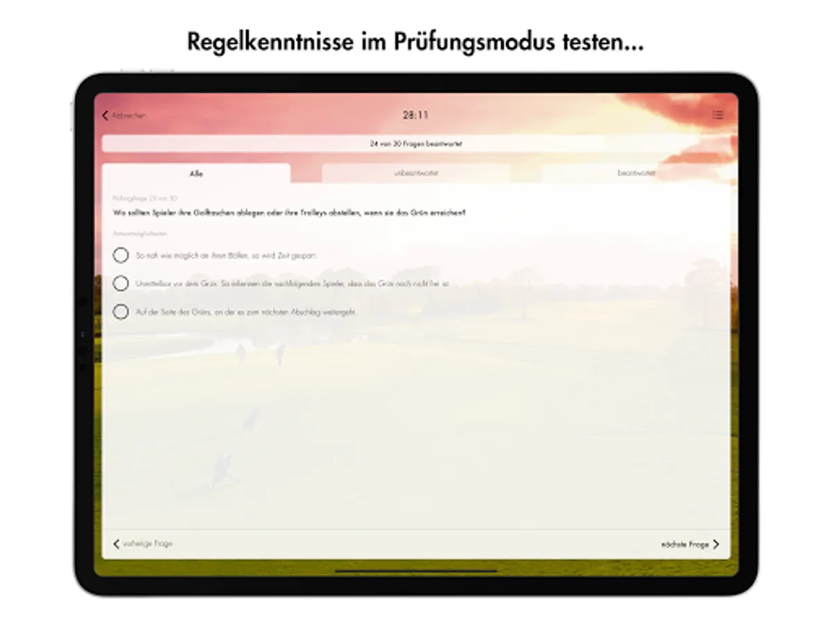 In exam mode, you have 30 minutes to answer 30 questions. The selection of questions in the examination mode is based on the same system that forms the basis of the questionnaire for the handicap examination.