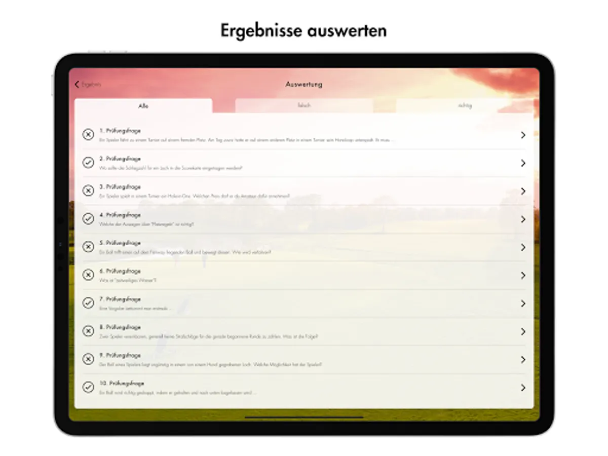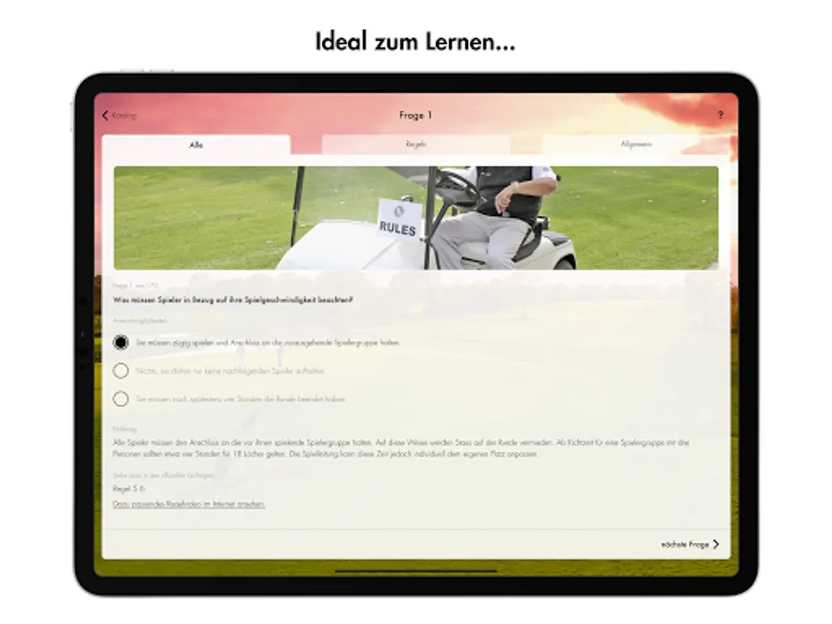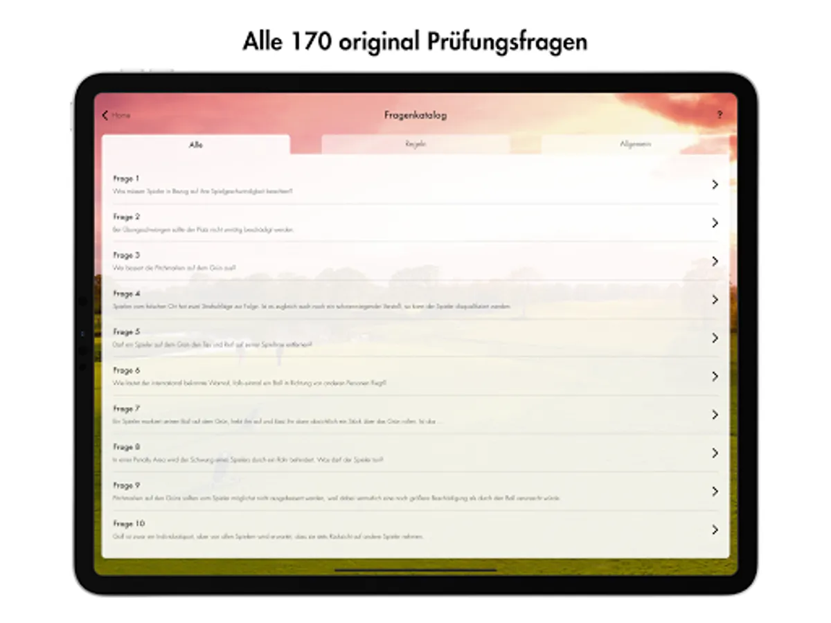 Quiz your way through all 170 original golf proficiency test questions. Test your knowledge in the exam mode or refresh your knowledge of the rules in the practice mode.