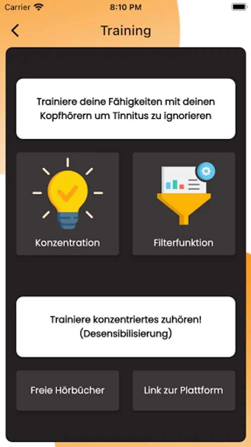 The app contains tests to determine cognitive processing power (central hearing test), standardized questionnaires with anonymous, statistical recording and training modules to train the filter dysfunction and to alleviate the perception of chronic tinnitus variants. Also included is a soundbar with natural sounds to relax from tinnitus.
