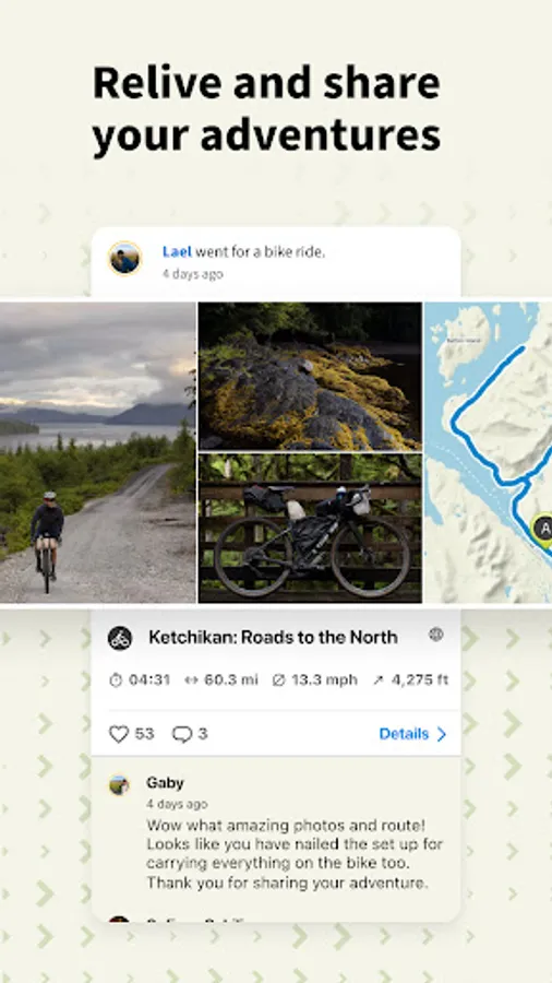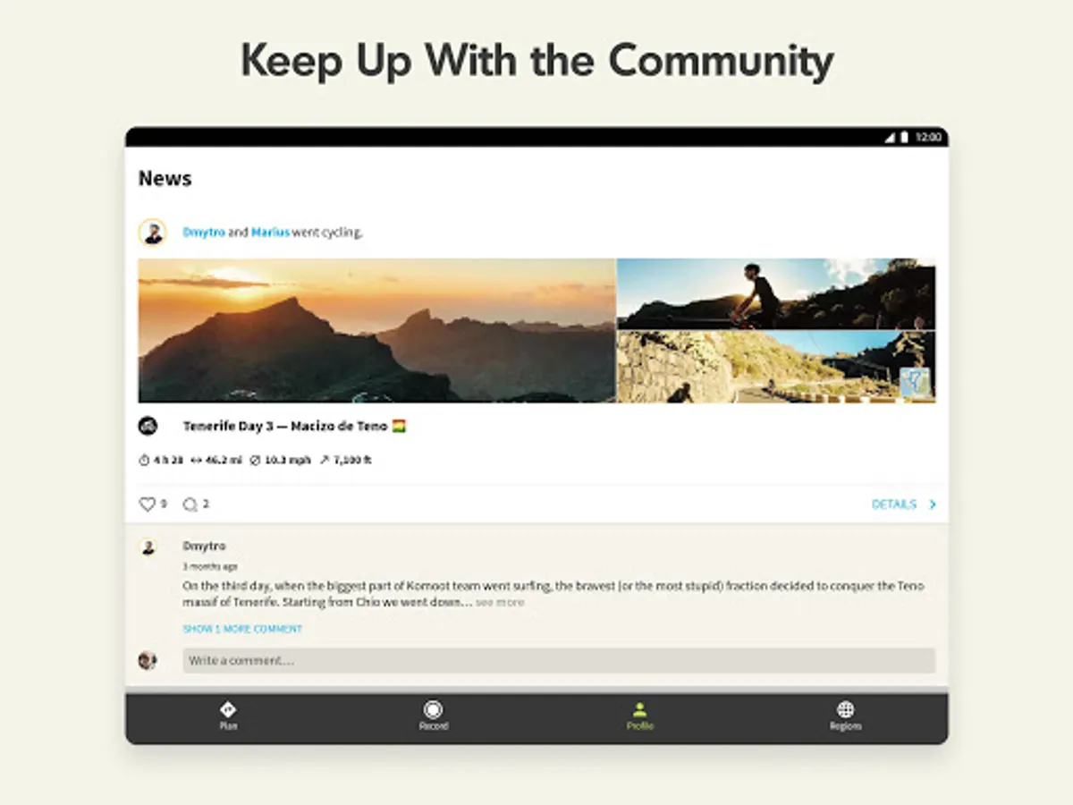 Map your bicycle, walking and running adventures with the GPS tracker. Add photos, Highlights and tips and build your own personal adventure log that’ll store your favorite experiences—forever. Save them for private use or share them with the komoot community. Follow your friends and like-minded explorers to keep up with their outdoor adventures.