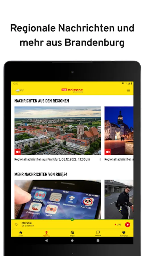 Listen to the latest regional news from Antenne Brandenburg from Cottbus, Frankfurt (Oder), Perleberg, Prenzlau and Potsdam in our new regional area, recommendations for excursions and information about Brandenburg districts and cities.