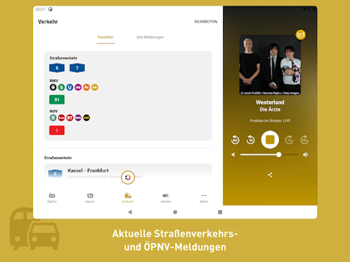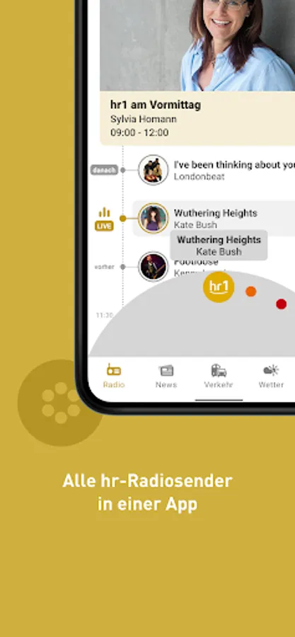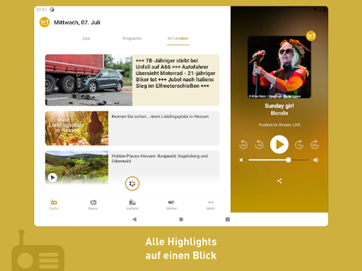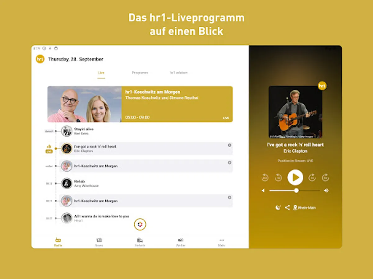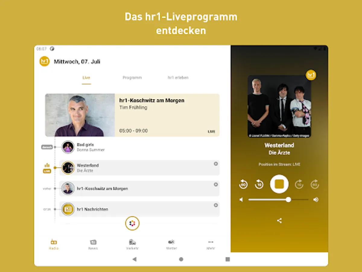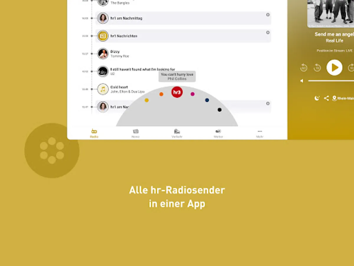 The new hr1 app is here! Listen to hr1 live, jump back in the program, current information, switch to all hr channels at any time, traffic and public transport reports as well as regional weather - all of this is available in the new app.