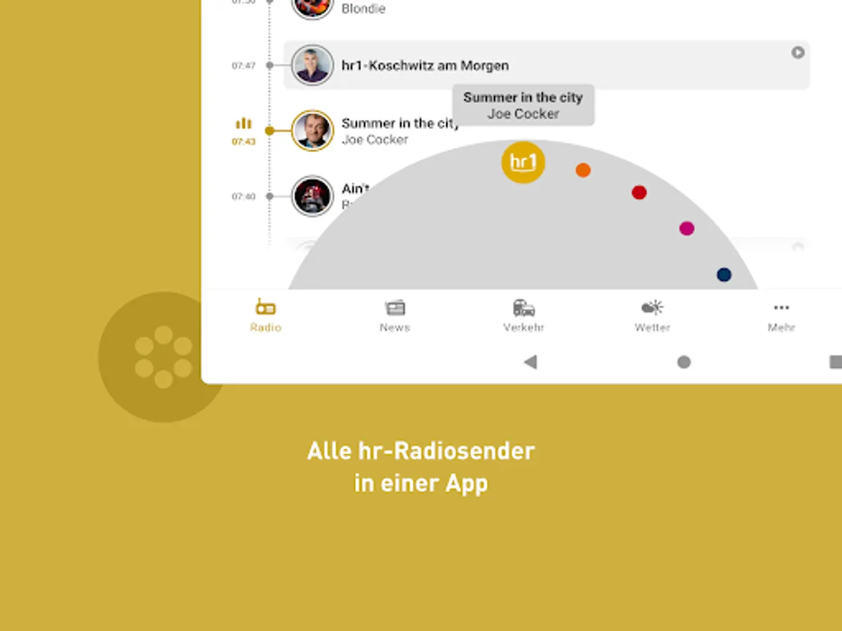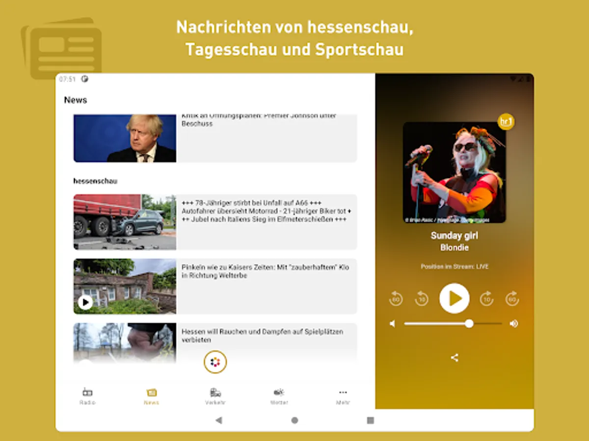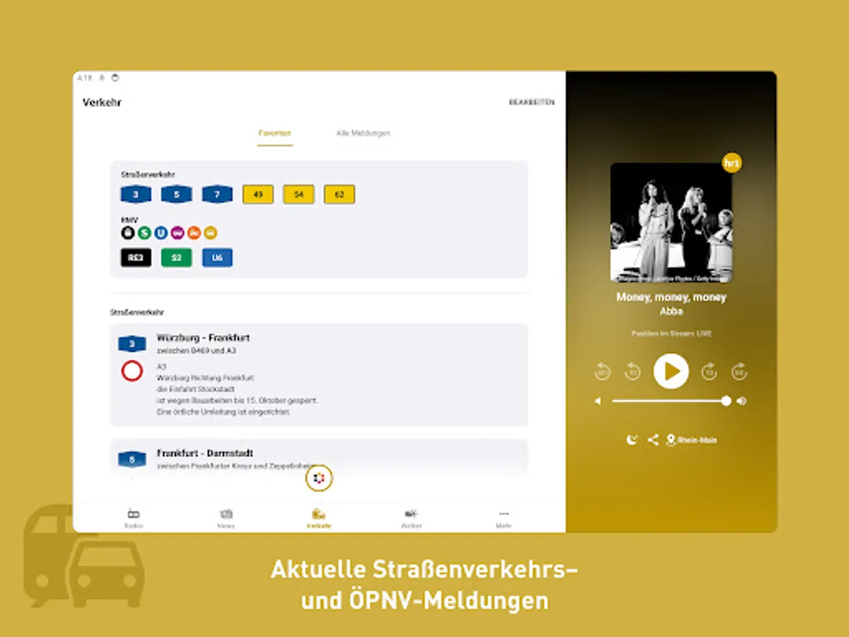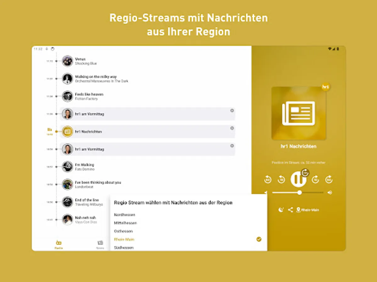 The new hr1 app is here! Listen to hr1 live, jump back in the program, current information, switch to all hr channels at any time, traffic and public transport reports as well as regional weather - all of this is available in the new app.