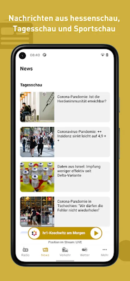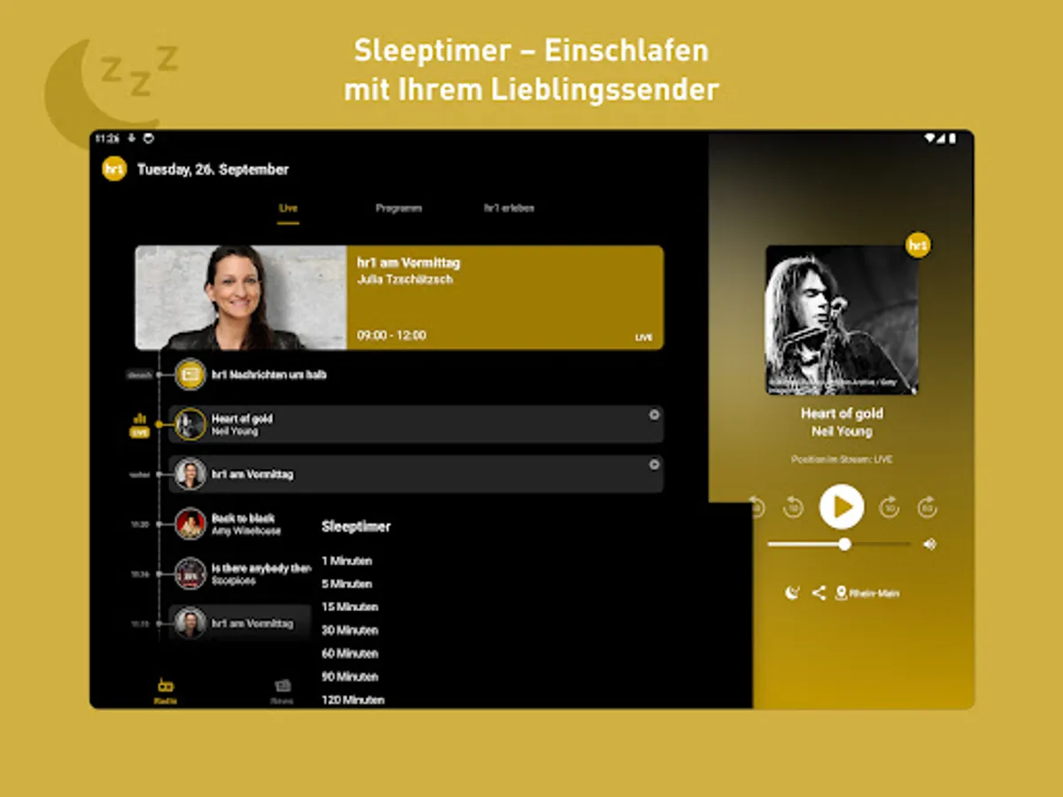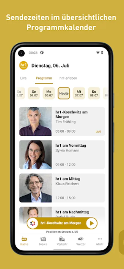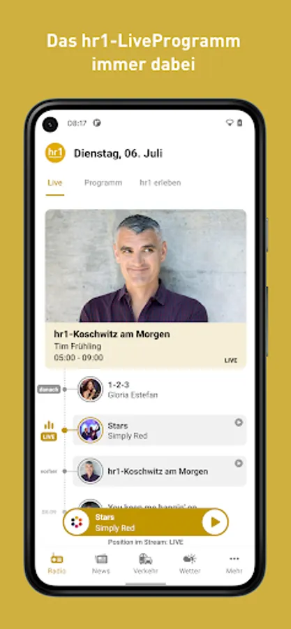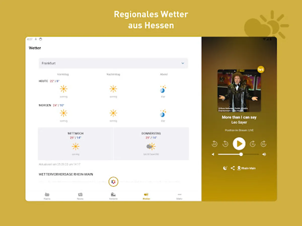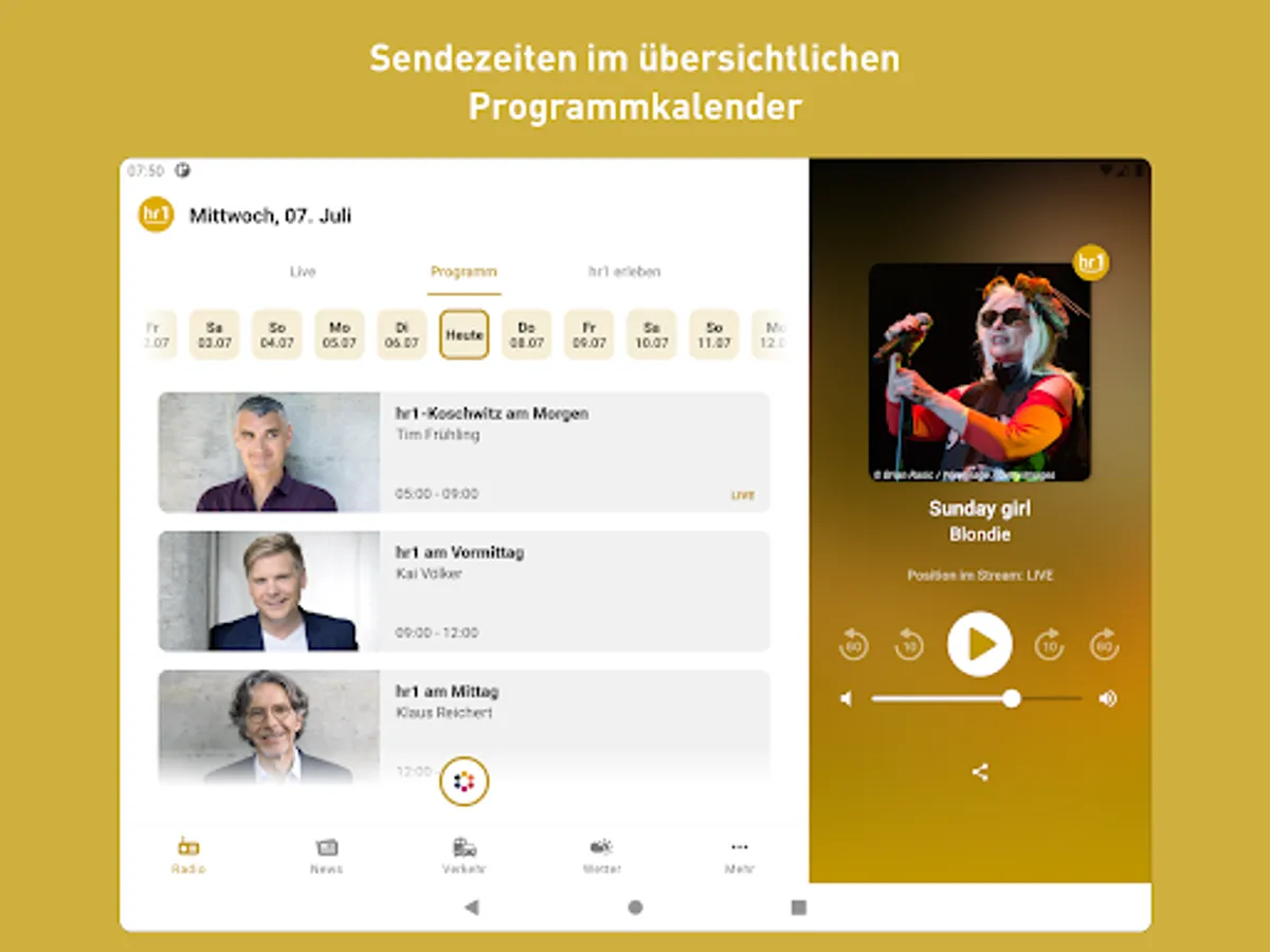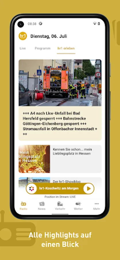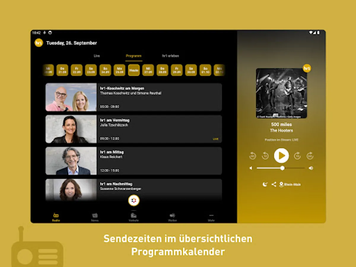 The new hr1 app is here! Listen to hr1 live, jump back in the program, current information, switch to all hr channels at any time, traffic and public transport reports as well as regional weather - all of this is available in the new app.
