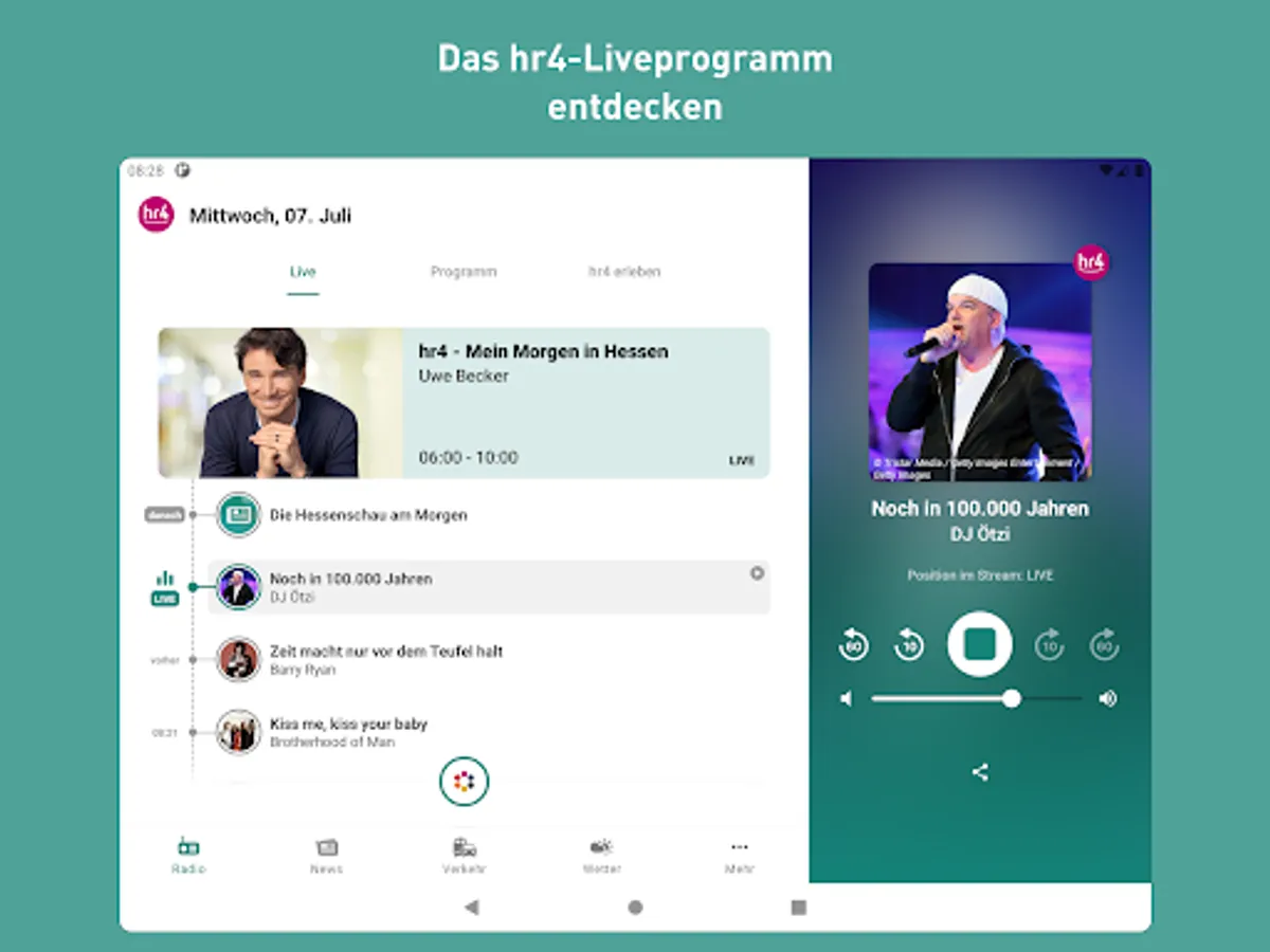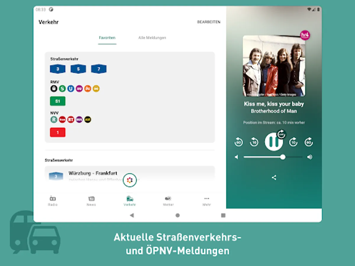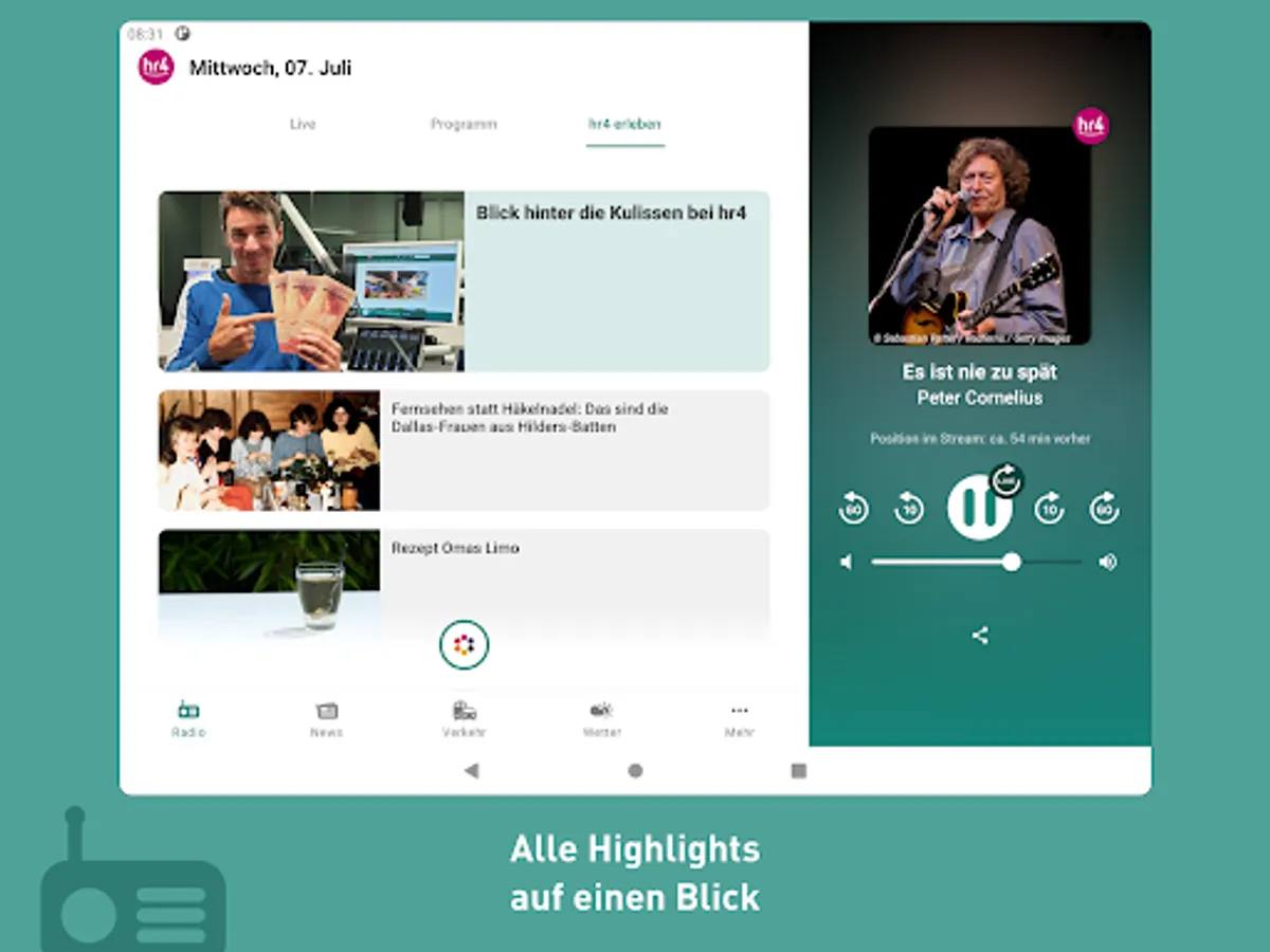 The new hr4 app is here! Listen to hr4 live, jump back in the program, current information, switch to all hr channels at any time, traffic and public transport reports as well as regional weather - all of this is available in the new app.